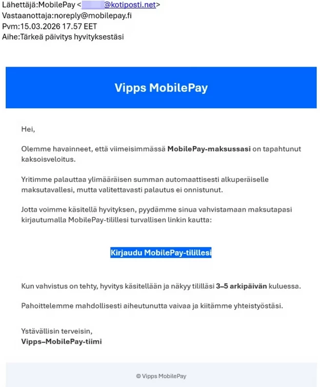 Vastaako viestin sisältö odotuksia siitä, millaiseen viestintään olet kyseisen yrityksen kohdalla tottunut. Jos viesti sisältää kirjoitusvirheitä tai on huonoa suomea, niin kannattaa suhtautua varauksella.