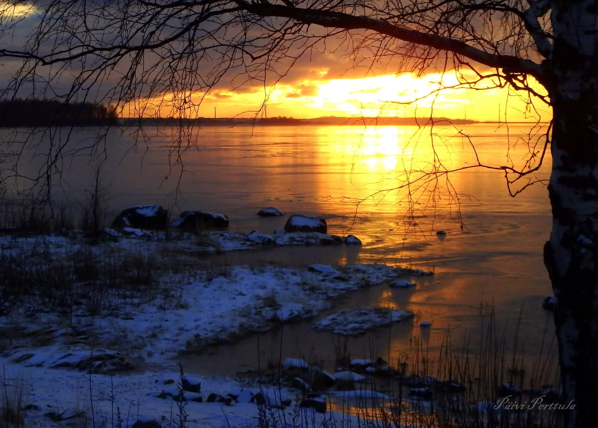 Auringonlaskun aikaan kolmen maissa iltapäivällä Kemissä 14.11. Ei ole vielä talvi.