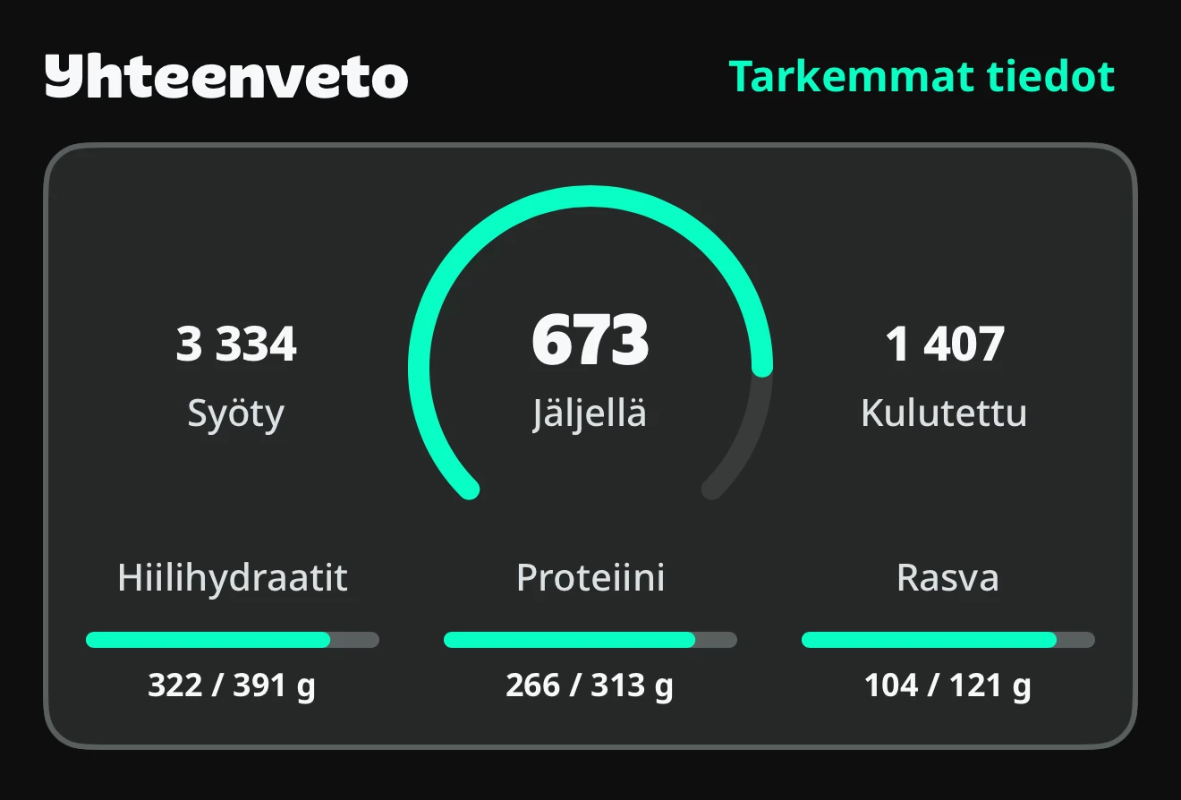 - 3000 kaloria - 500 kaloria = päivän kaloritavoite 2500 kaloria