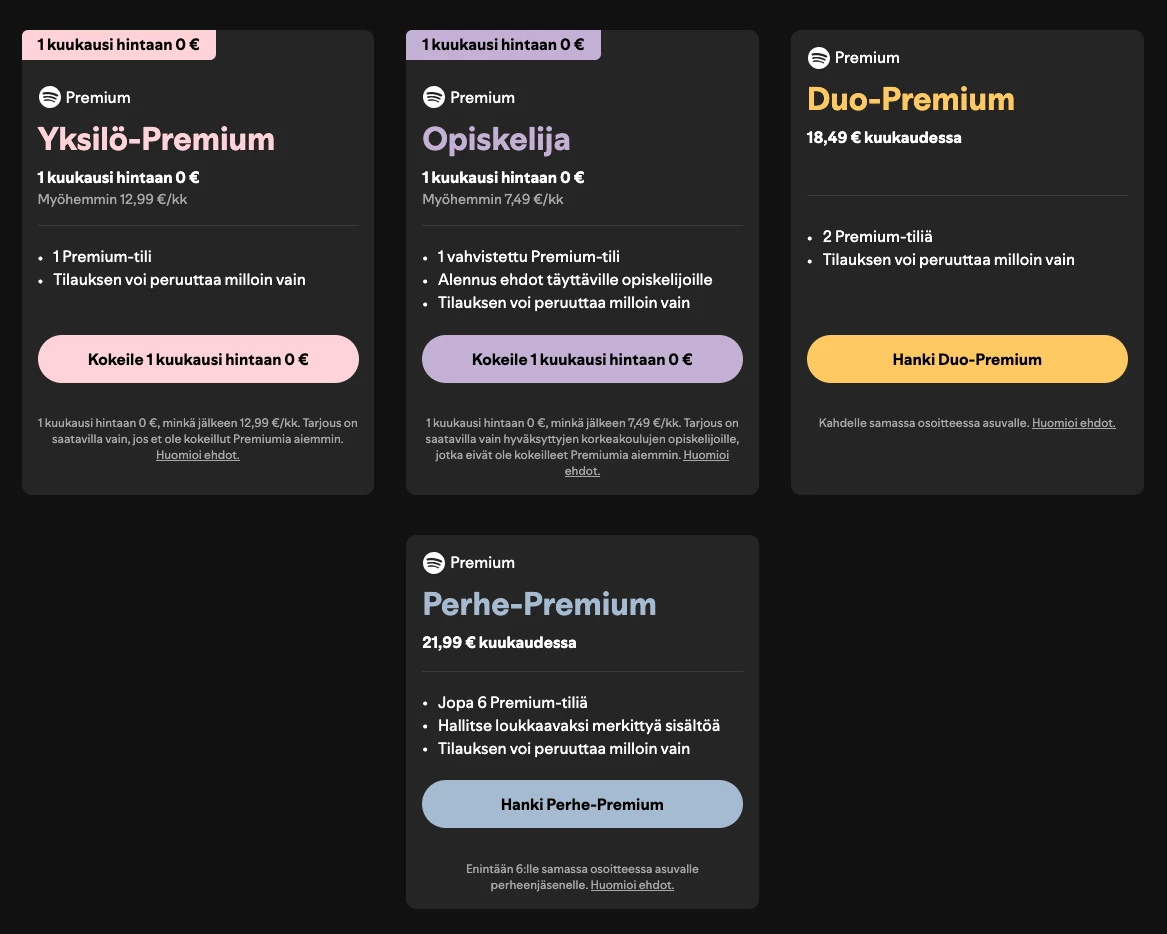 Nihilistinä ollaan käytetty vaimon kanssa samaa tiliä, vuorotellen 😀 Spotify nostaa myös hintojaan, toki sitä tapahtuu nyt kaikkialla muuallakin, ja olen miettinyt, että hankinko DUO- tai Perhe-Premiumia vai olisiko muualla parempaa ratkaisua ja kenties edullisempaan hintaan. Aika kovilta hinnoilta tuntuvat, kyseessä on kuitenkin vain musiikkipalvelu (podcasteja en kuuntele).