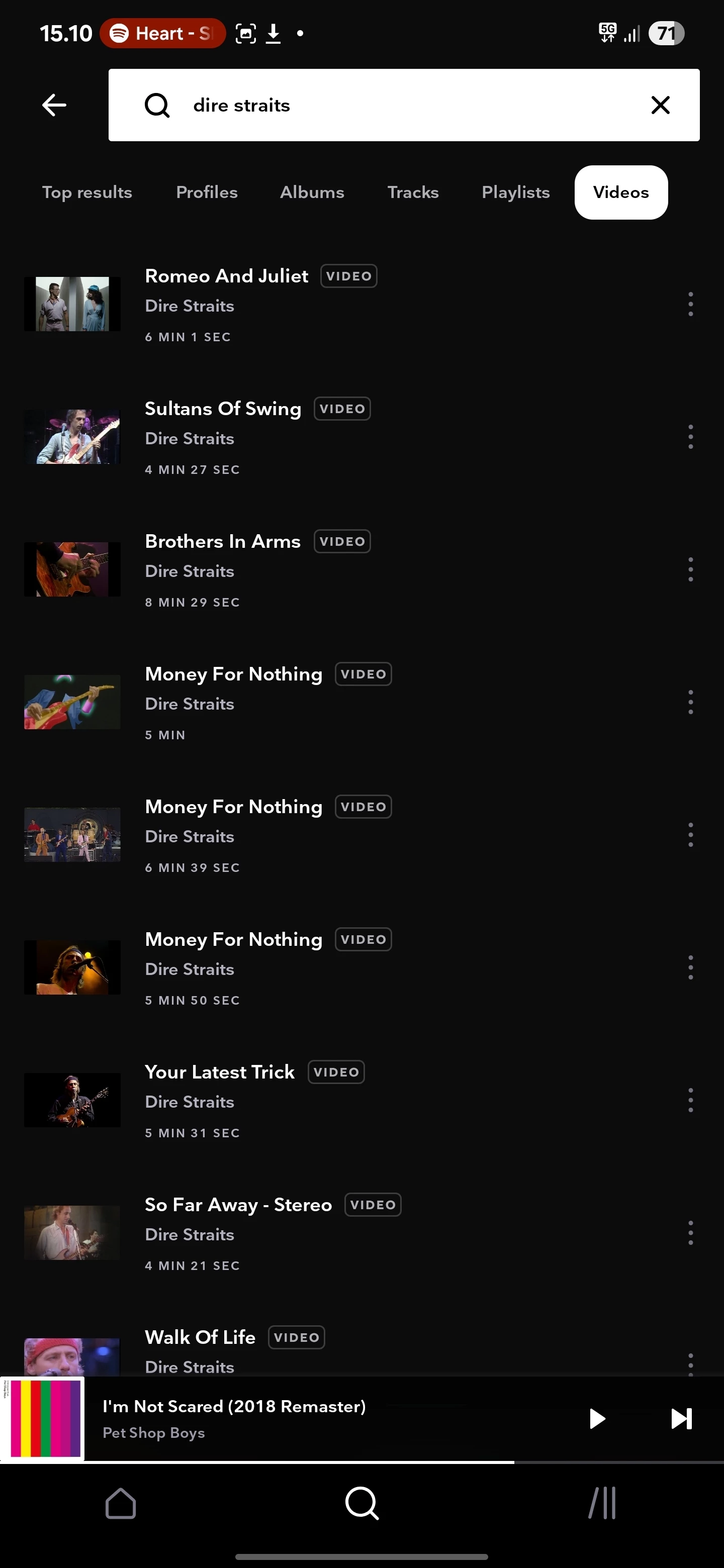 Videoista, joko en osaa tai Spotify on vaikeakäyttöinen, ei löydy kuin jotain podcast tai kommenttiraitoja. Jos etsii vaikka Dire Straitsin musiikkivideoita. Tidalista löytyvät heti kaikki videot: