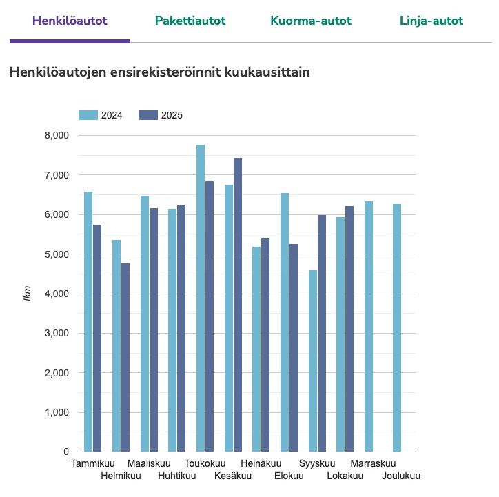 Tammi-lokakuussa 2025 ensirekisteröitiin 60 167 uutta henkilöautoa, mikä oli 2 % vähemmän kuin vuotta aiemmin.