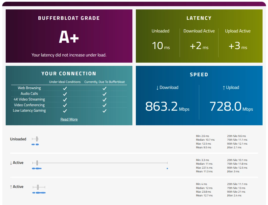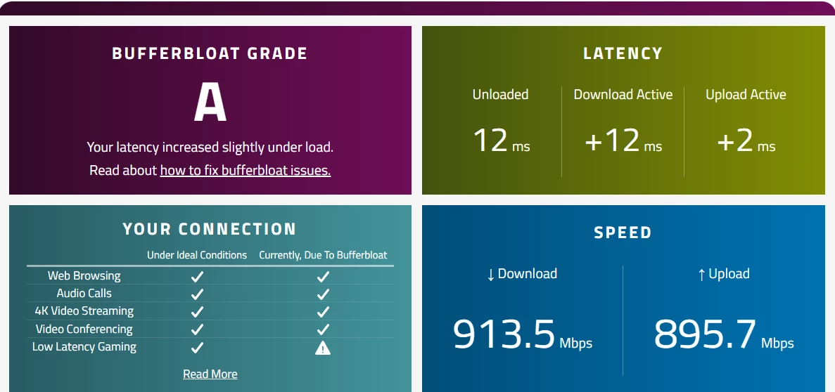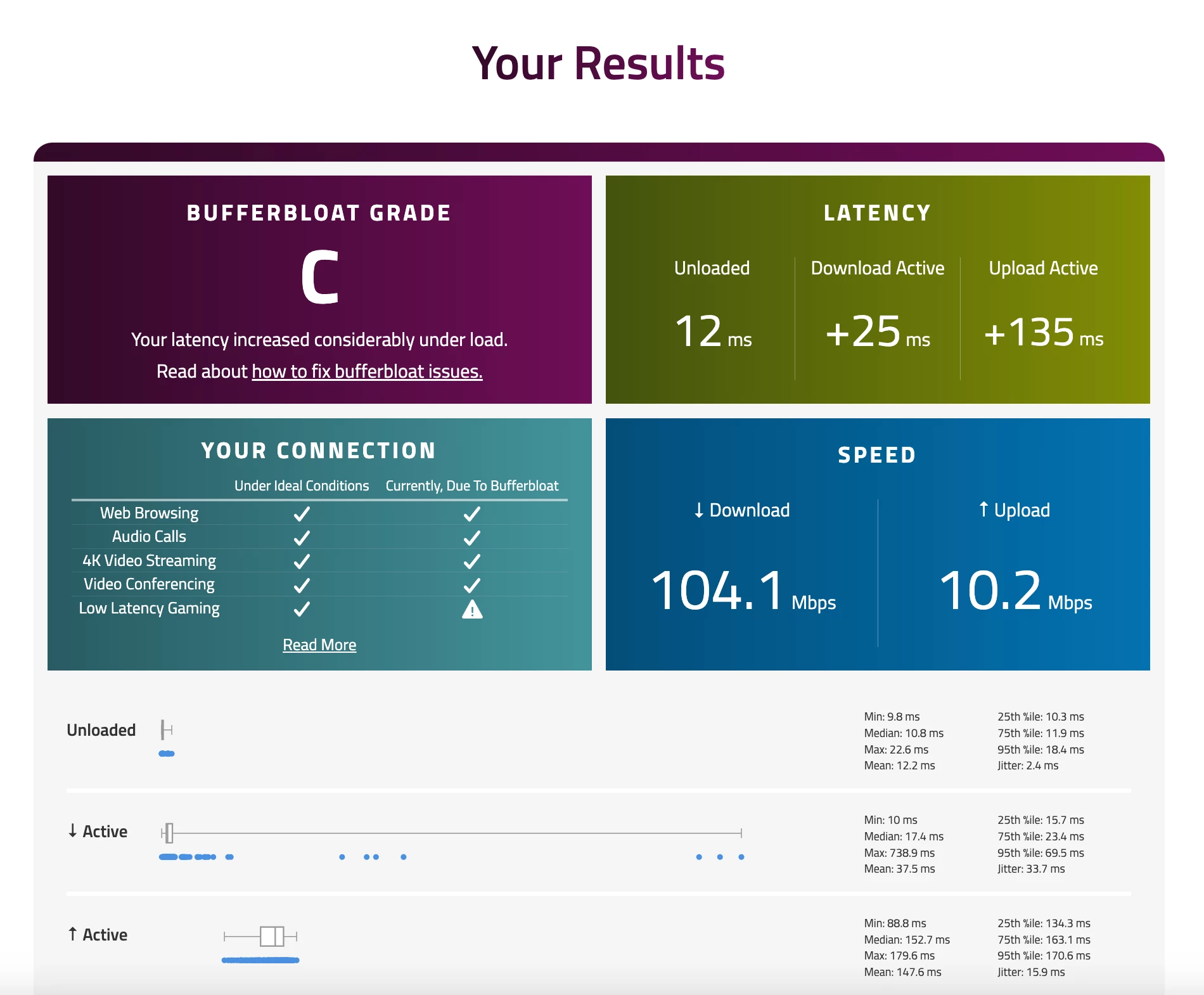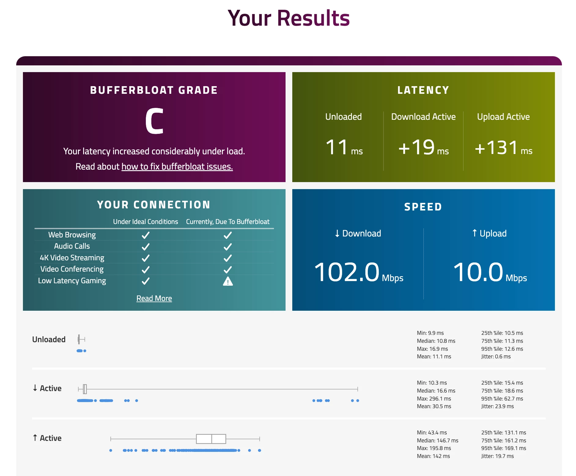 Ongelmia aiheuttaa ilmeisesti upload (10mbps) kaistan tukkeutuminen (bufferbloat). Telian reititin Zyxel DX3300-T1 -reititin ei pysty hallitsemaan bufferbloatia lainkaan. Onko joku saanut ongelmaa ratkaistua toisella reitittimellä ja päässyt sillä A-tuloksiin bufferbloat-testillä (https://www.waveform.com/tools/bufferbloat?srsltid=AfmBOorKG5r6PrzzTzAZiQC9FH0vGsf3e7y9FSMoldC1WYzKB0tnPqAg).
