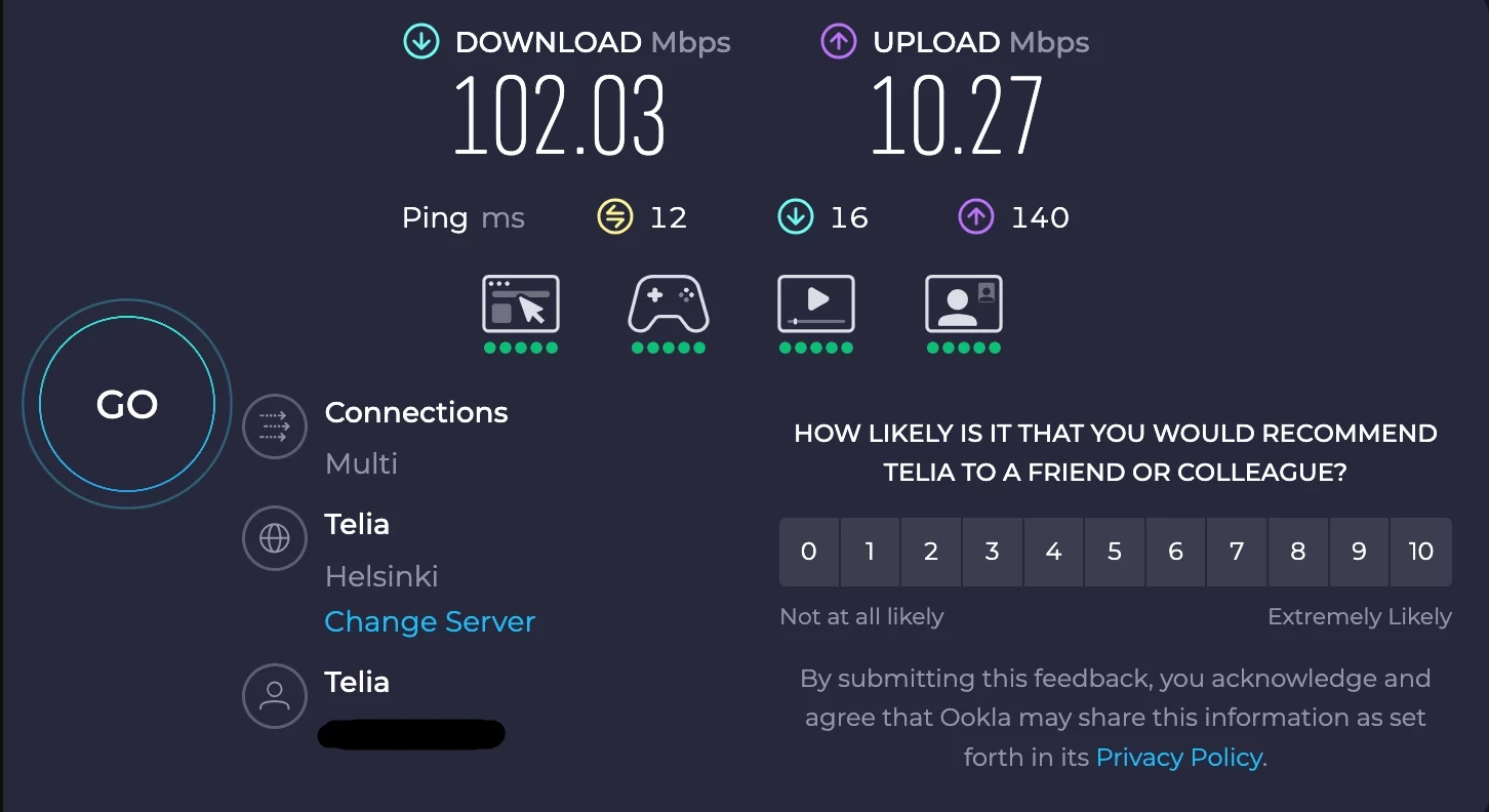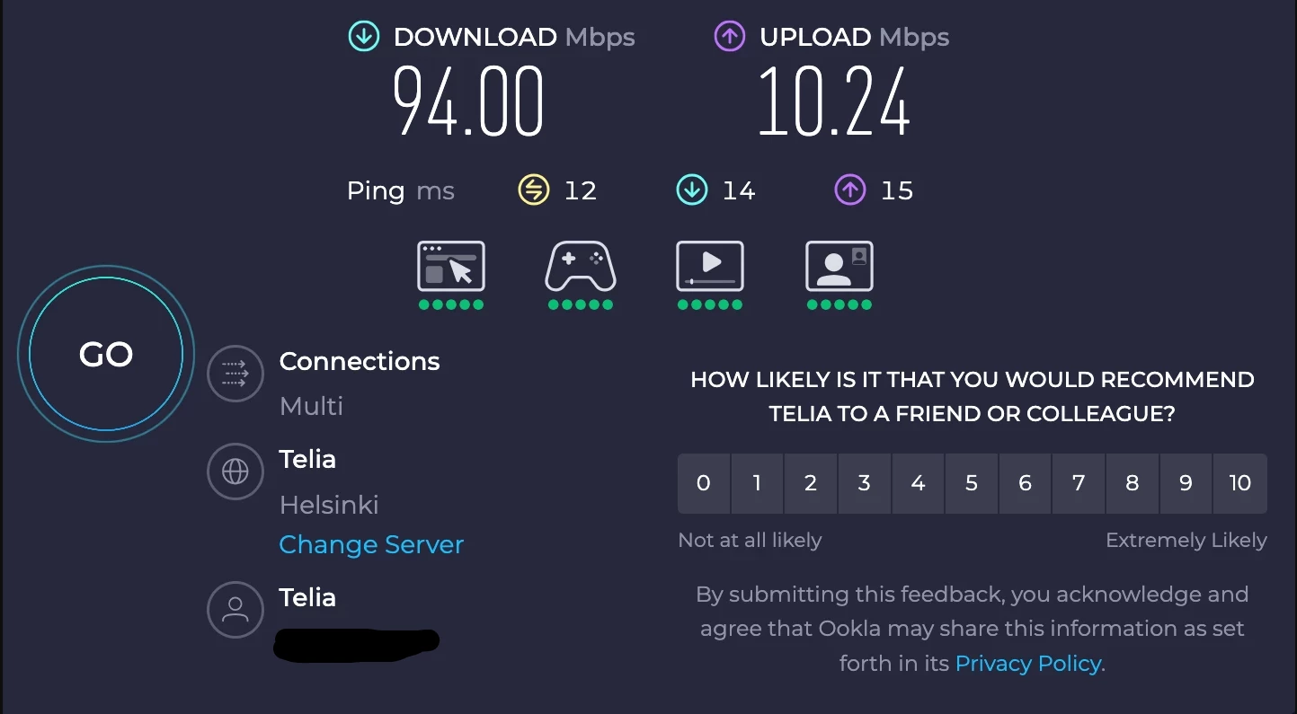 Olen kauhukseni havainnut, että Telian 100/10 mbps valokuitu ei riitä millään verkkopelaamiseen, vaikka ping pysyy erittäin tasaisena.