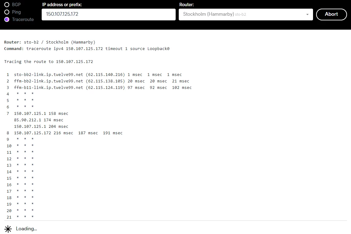 Mikähän telian runkoverkossa on vialla, kun aina välillä alkaa pingit nousta ja paketteja hukkua? Tänään meni ihan mahdottomaksi taas illalla ja piti lopettaa pelaaminen. Testasin sitten paria traceroutea ja huomasin, että ongelma näyttäisi olevan Tukholman ja Frankfurtin välisessä hypyssä.