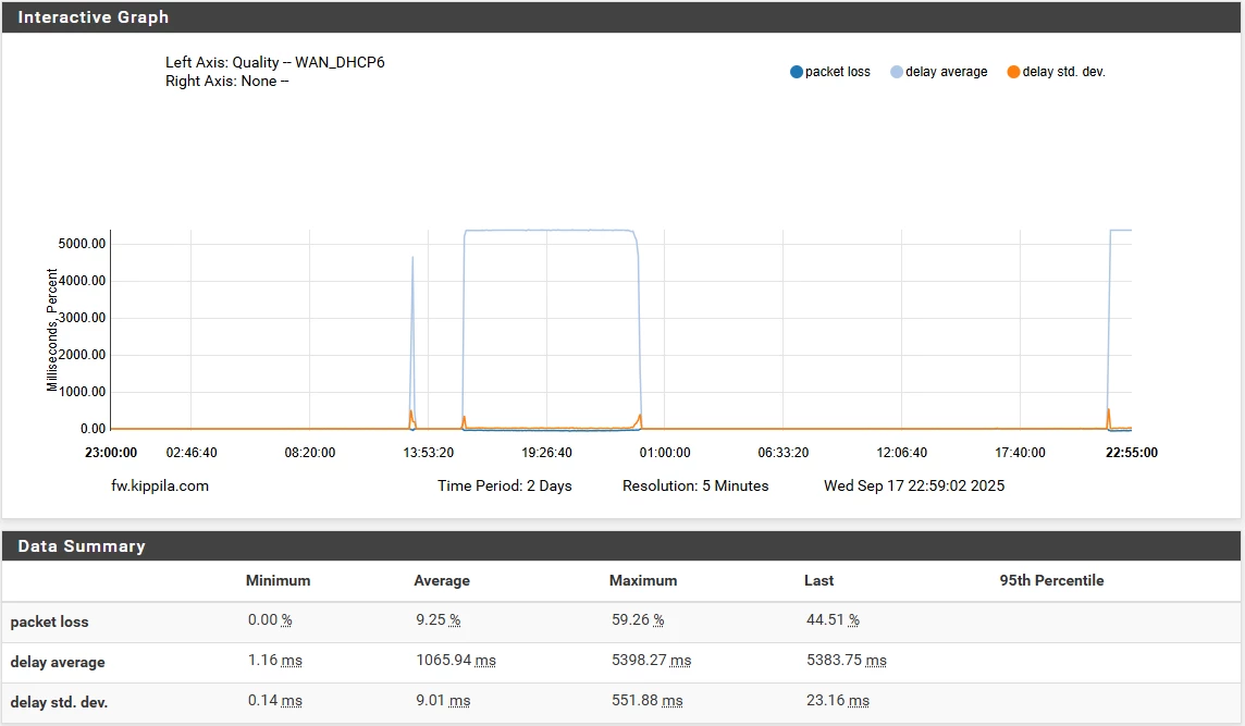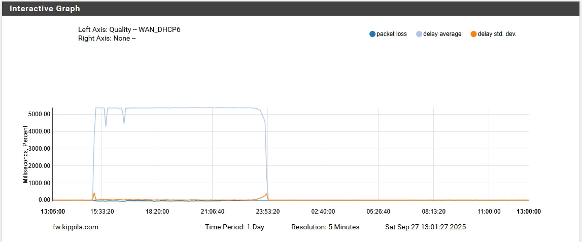 Minulla on valokuitusen kuitu telian liittymällä ja ipv6 on säännöllisen epäsäännöllisesti jumissa. Tämän huomaa pfsensen ipv6 gw monitorista, kun pingit kasvavat hurjiksi ja samalla verkon käyttö ipv6:n yli alkaa tökkiä. Onko muilla tätä samaa ongelmaa?