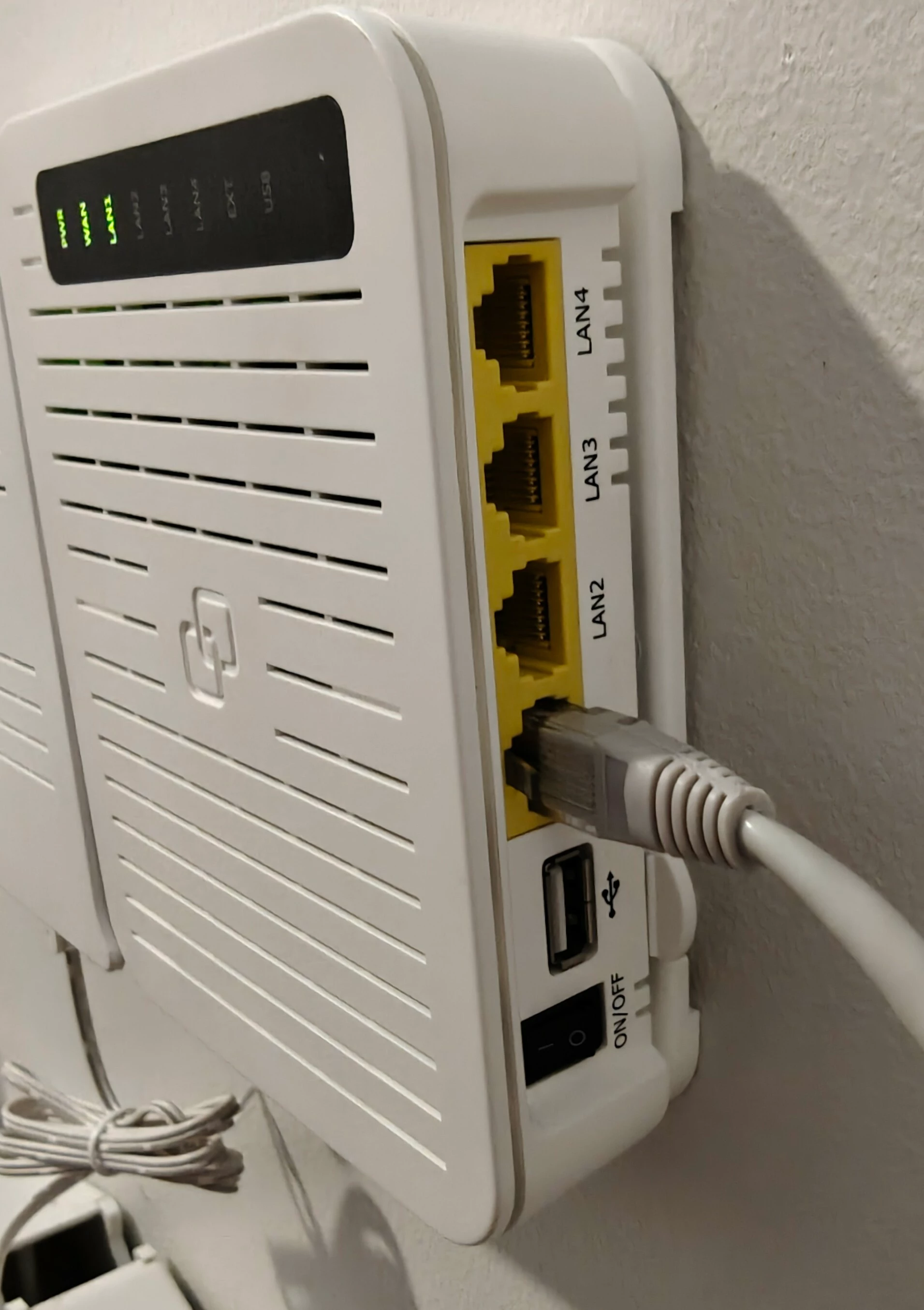 Cat kaapeli WAN porttiin kuten pitääkin, LAN1 lähtee letku läppärille jotta pääsen routteriin "sisään".