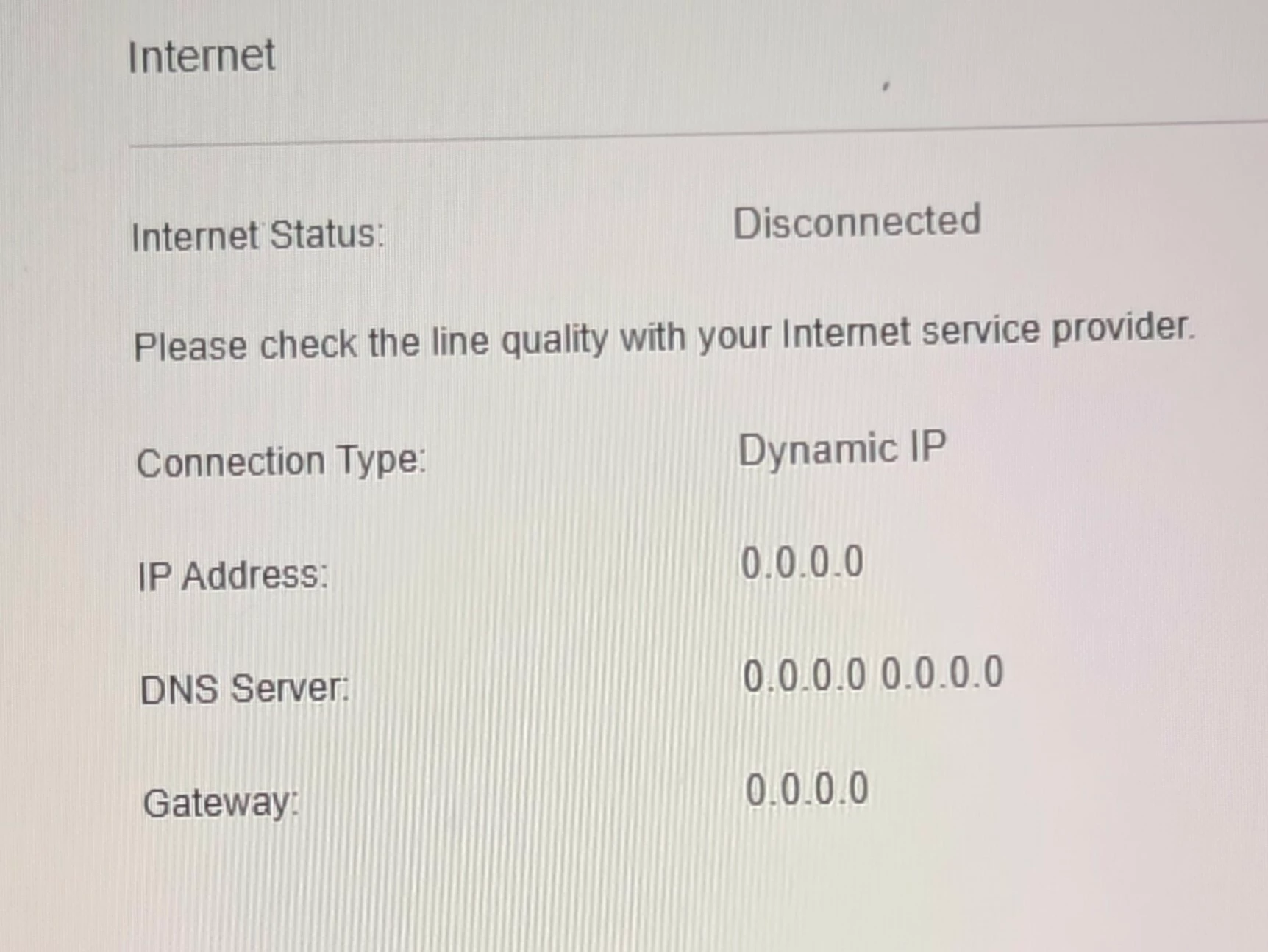 Routterille kirjautuessa näen ettei yhteys saa haettua IP osoitetta ja näyttää 0.0.0.0.