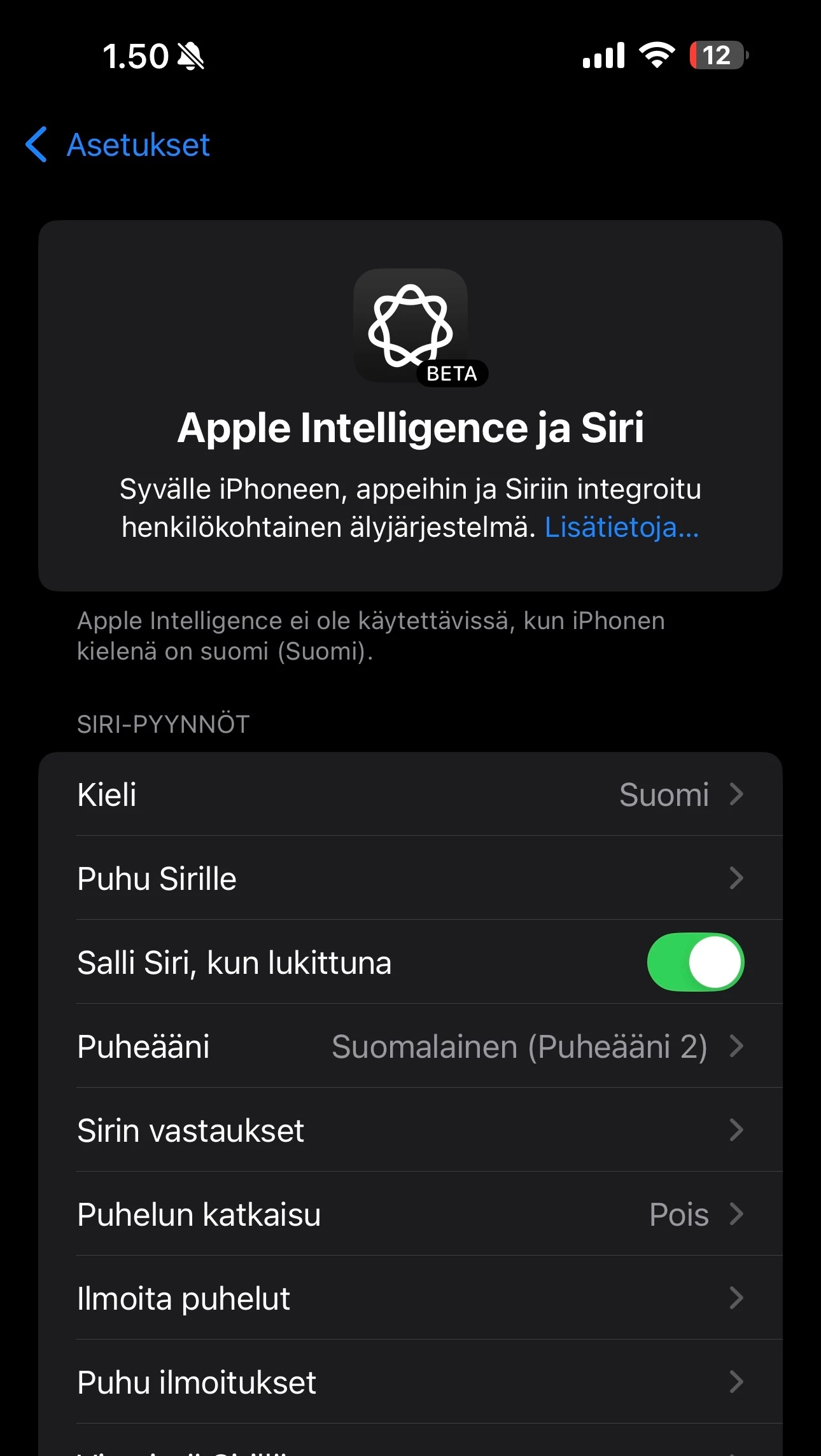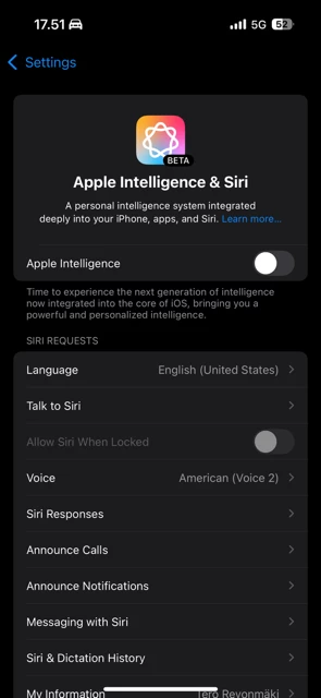 Tällä hetkellä huono puoli on, että Apple Intelligence toimii ainoastaan, kun valitset laitteen kieleksi englannin. Onkohan tämä pakote myöhemmin muuttumassa? Applen tekoälyominaisuudet toimivat ainoastaan iPhone 16, iPhone 15 Pro tai iPhone 15 Pro Max -puhelimissa.
