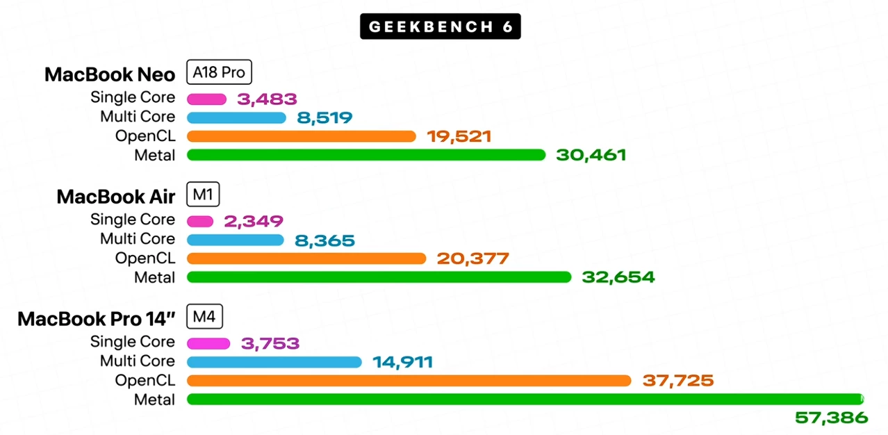 Macbook Neo jopa yllättää, kuinka paljon se saa irti A18 Pro -sirusta. Usean arvostelun pohjalta testitulokset antavat todella lupaavia tuloksia. Alle olen lisännyt kuvan Marques Brownlee -Youtubekanavan tuloksista.