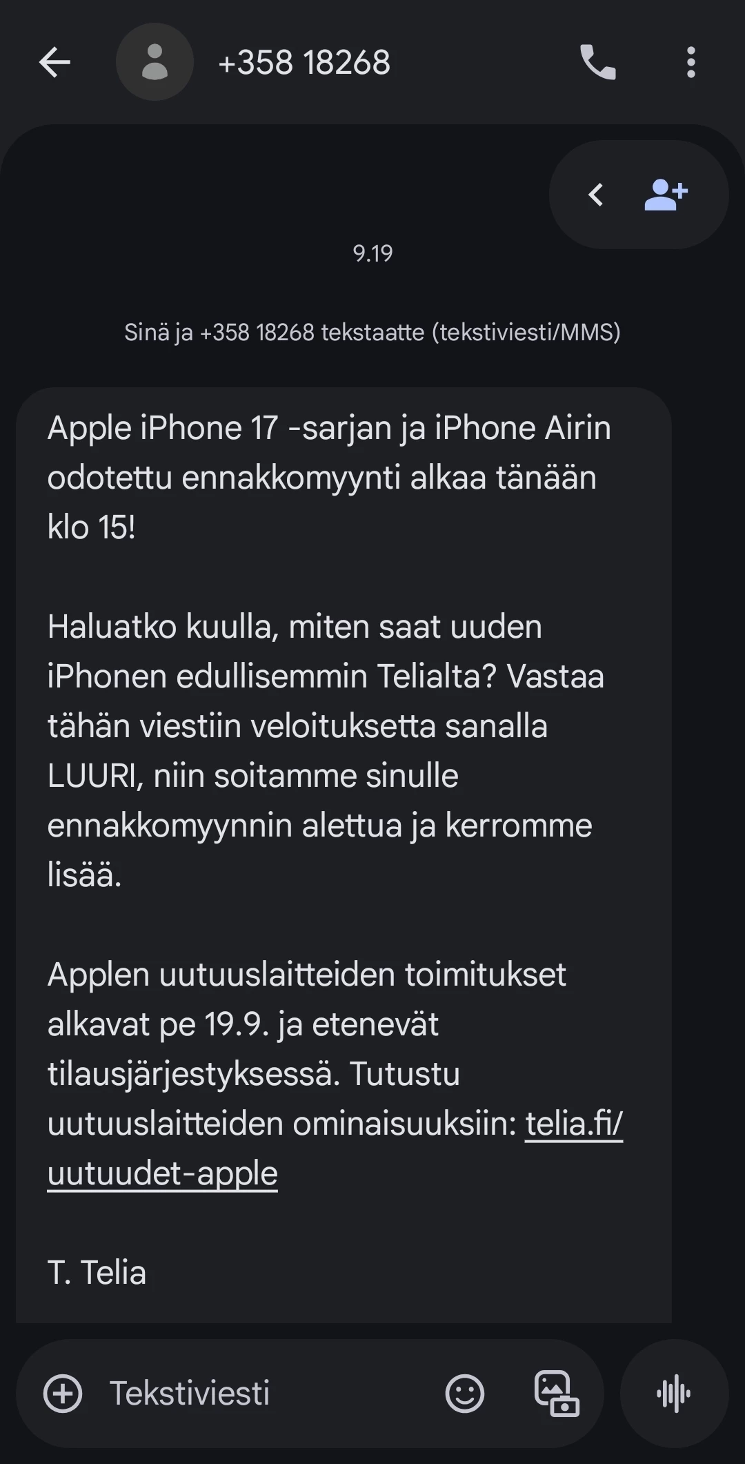 Huomioithan myös, että eri iPhone-malleja (17 / 17 Air / 17 Pro / 17 Pro Max + jokaisesta eri muistikoot sekä värit) tulee eri määrä varastoon joten voi hyvin olla, että myöhemmin tehty tilaus toimittuu aiemmin, koska juuri sitä mallia tuli varastoon enemmän.
