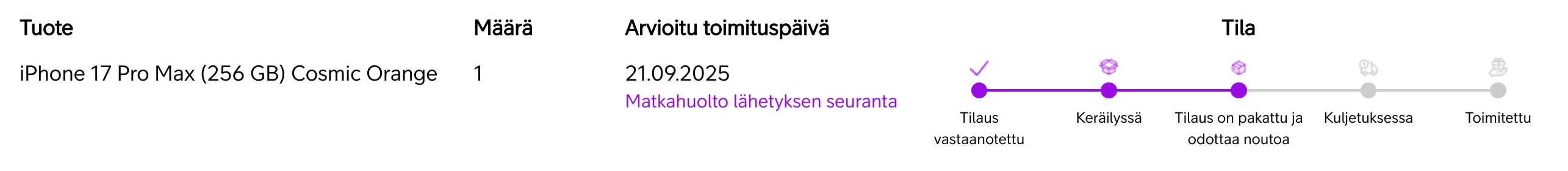 Mulla kaatui juuri koko tilausseuranta. Ei aikea enää olleskaan, mutta sitä ennen näytti ensin 19.9. ja myöhemmin 22.9. Saas nähdä, miten käy.. 😅