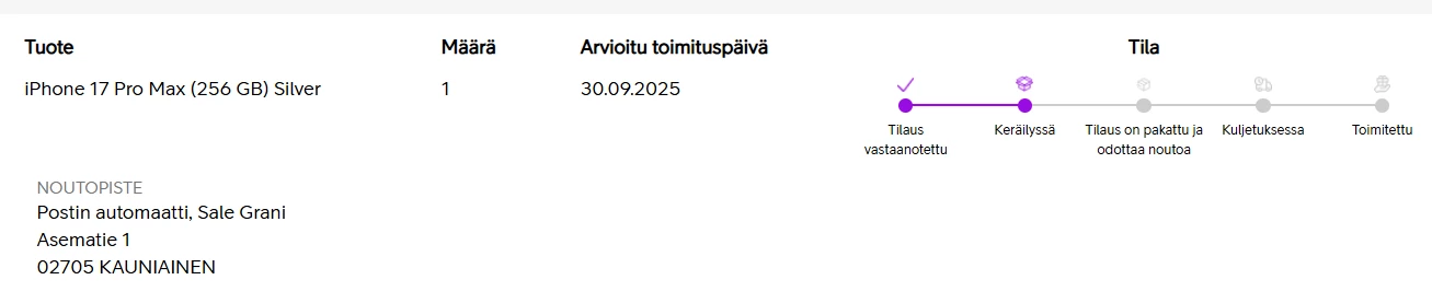 Huomioithan myös, että eri iPhone-malleja (17 / 17 Air / 17 Pro / 17 Pro Max + jokaisesta eri muistikoot sekä värit) tulee eri määrä varastoon joten voi hyvin olla, että myöhemmin tehty tilaus toimittuu aiemmin, koska juuri sitä mallia tuli varastoon enemmän.