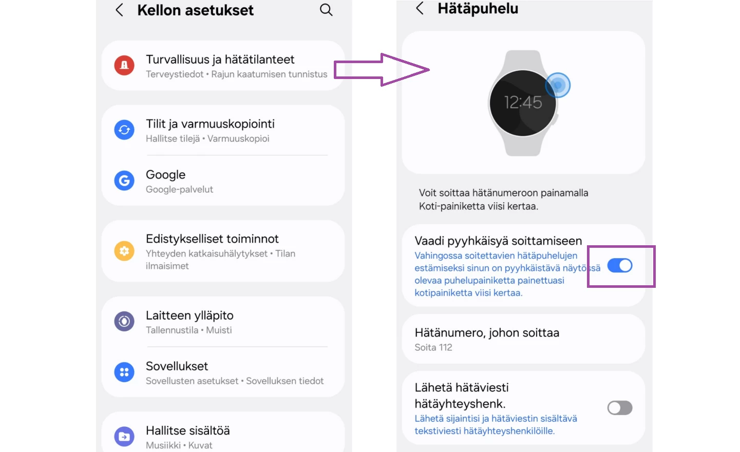 Galaxy Wearable -sovelluksesta pääset muokkaamaan mm. hätänumeroon soittoa, hätäviestin lähetystä läheiselle sekä rajun kaatumisen tunnistamista.