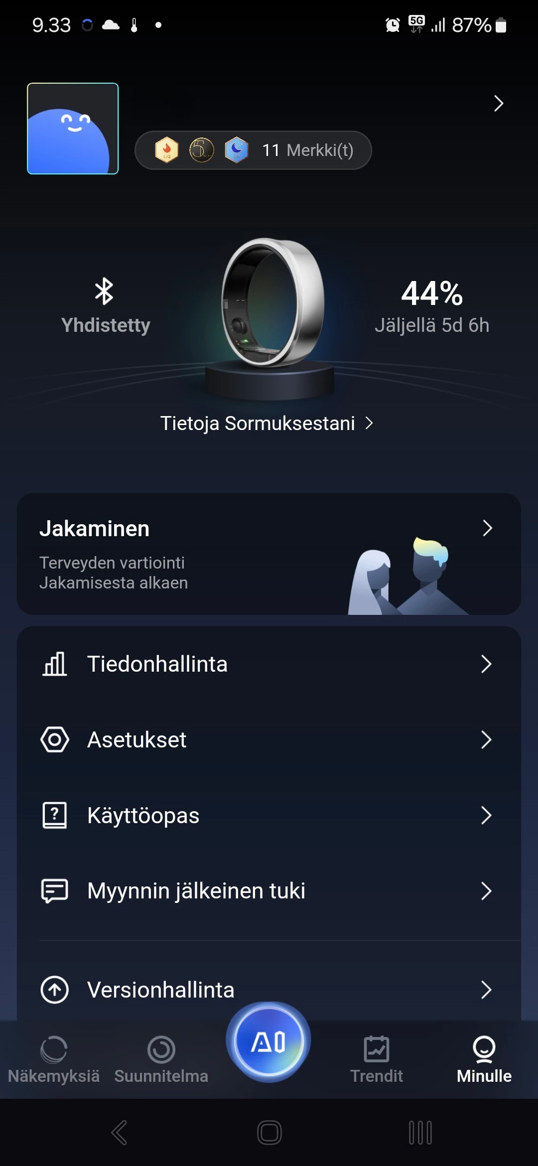 Sormuksen kestävyydestä kertoo sen IP68-luokitus, joka takaa vesi- ja pölytiiviyden. Vesitiiviys kattaa laitevalmistajan mukaan 100 metriin asti. Myös akun kesto on vaikuttava, sillä se toimii yhdellä latauksella 10–12 päivää. Näin voit keskittyä arkeen ja hyvinvointitietojen seuraamiseen ilman jatkuvaa lataustarvetta. Optisten polkujen tarkentaminen ja algoritmien parantaminen ovat vähentäneet virrankulutusta, säilyttäen samalla sormuksen suorituskyvyn ennallaan.