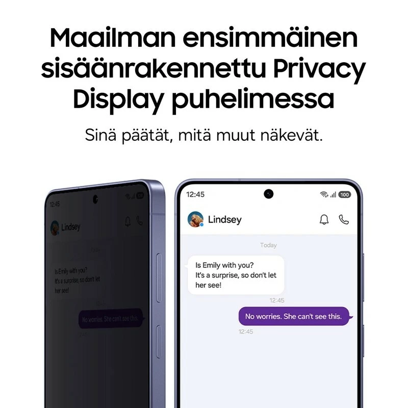 Galaxy S26 Ultra -mallista löytyvän Privacy Display -toiminteen avulla varmistat etteivät sivustaseuraajat näe puhelimesi näyttöä. Voit määritellä millä näytön alueilla haluat lisää yksityisyyttä, täyden näytön pimentämisen ohella voit esimerkiksi asettaa vain ilmoitukset, tai sovellukset toimimaan yksityisessä tilassa.