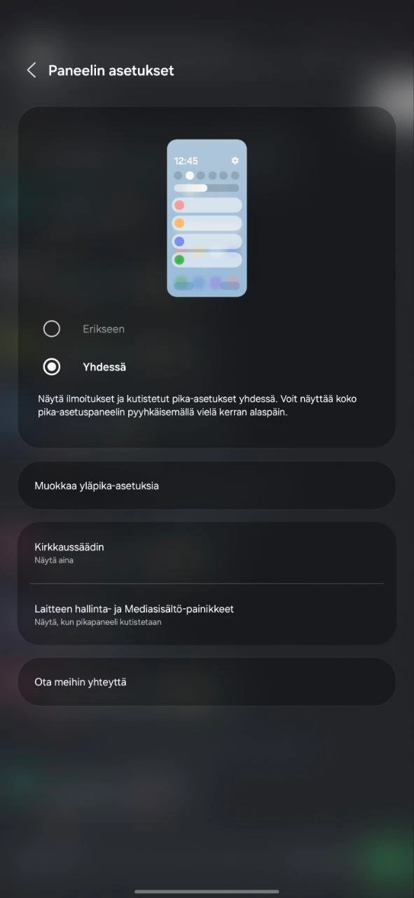 Yksi suurimmista ja selkeimmistä muutoksista päivityksen myötä on se, kuinka puhelimen näytön yläpalkissa, eli Quick Panelissa, navigoidaan. Ilmoitus- ja asetusnäkymät ovat erotettu uudistuksen myötä omiksi osioikseen, jotka avataan myös erilaisilla toiminnoilla. Quick Panelin asetusnäkymän avataksesi sinun tulee vetää näytön yläoikeasta reunasta. Ilmoituksien tarkastelemiseksi sinun tulee vetää keskeltä näytön yläosasta.