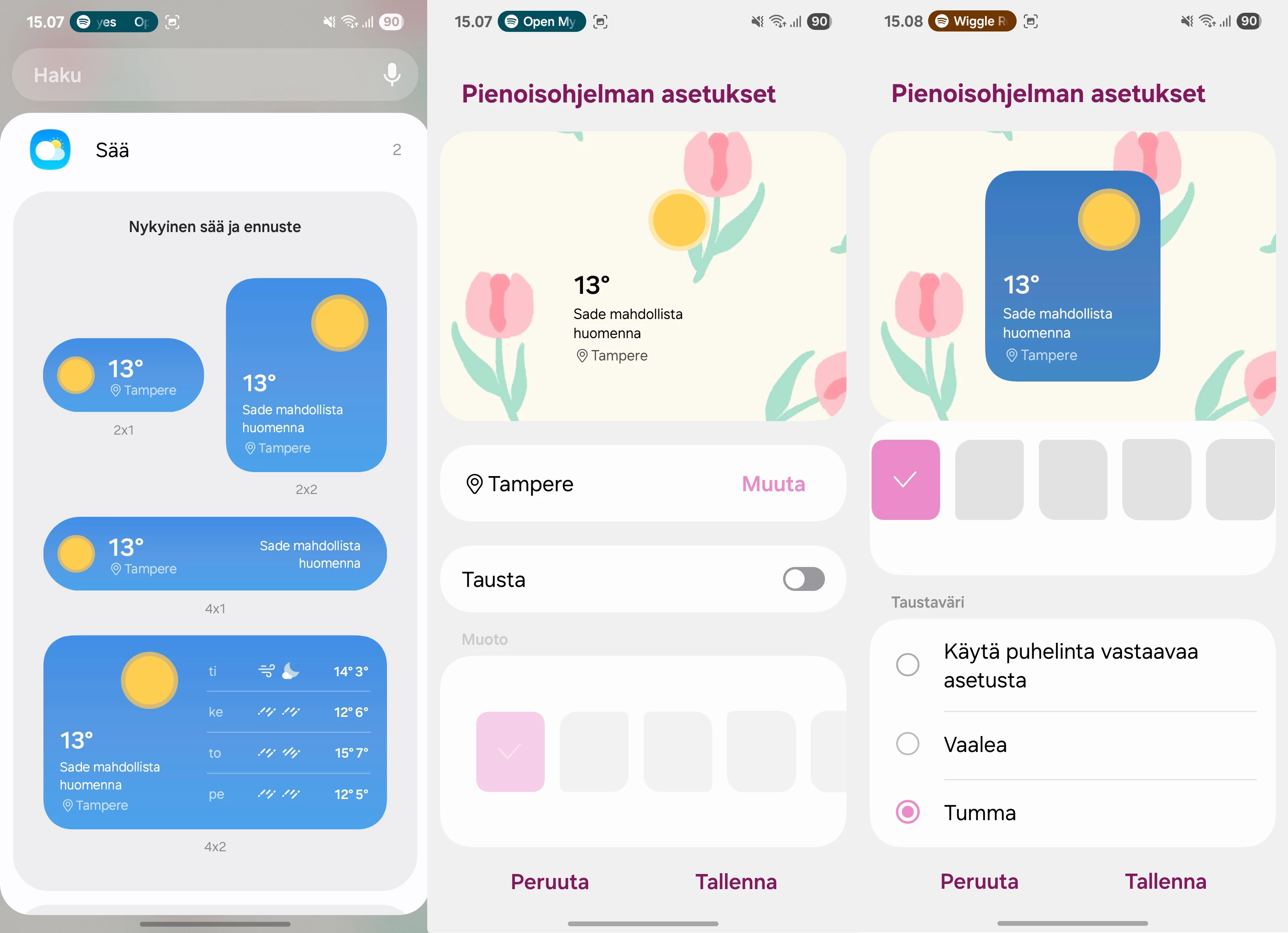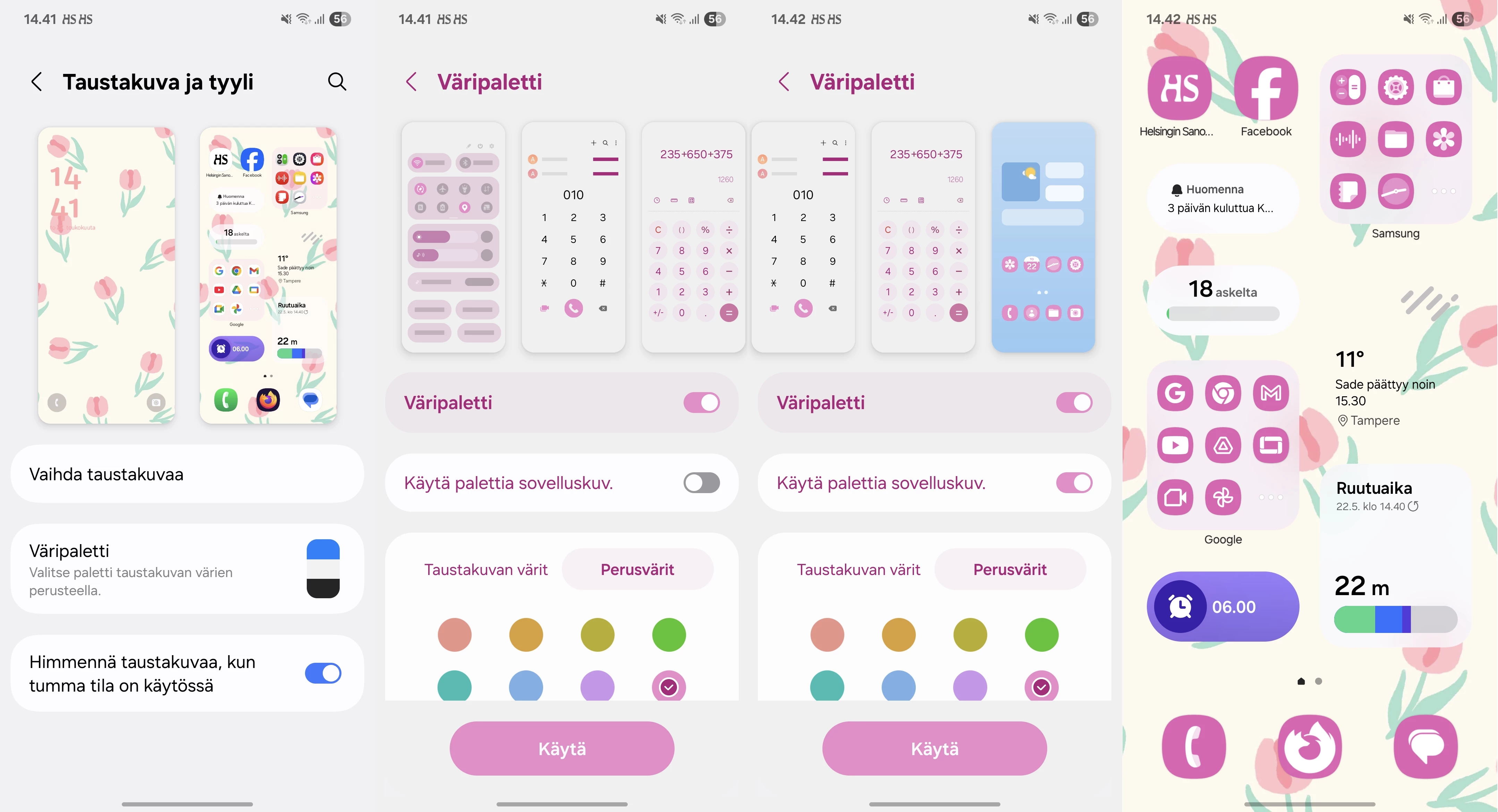 Aiemmista käyttöjärjestelmäversioista tuttu Samsung Galaxy -puhelimen teeman väripaletin vaihtaminen on saanut uuden päivityksen myötä enemmän sijaa. Nyt valittu väripaletti näkyy Quick Panelissa, eli näytön yläpalkissa ja muissakin sovelluksissa kuin Samsungin omissa. Halutessasi voit asettaa väripaletin sovelluskuvakkeisiin.