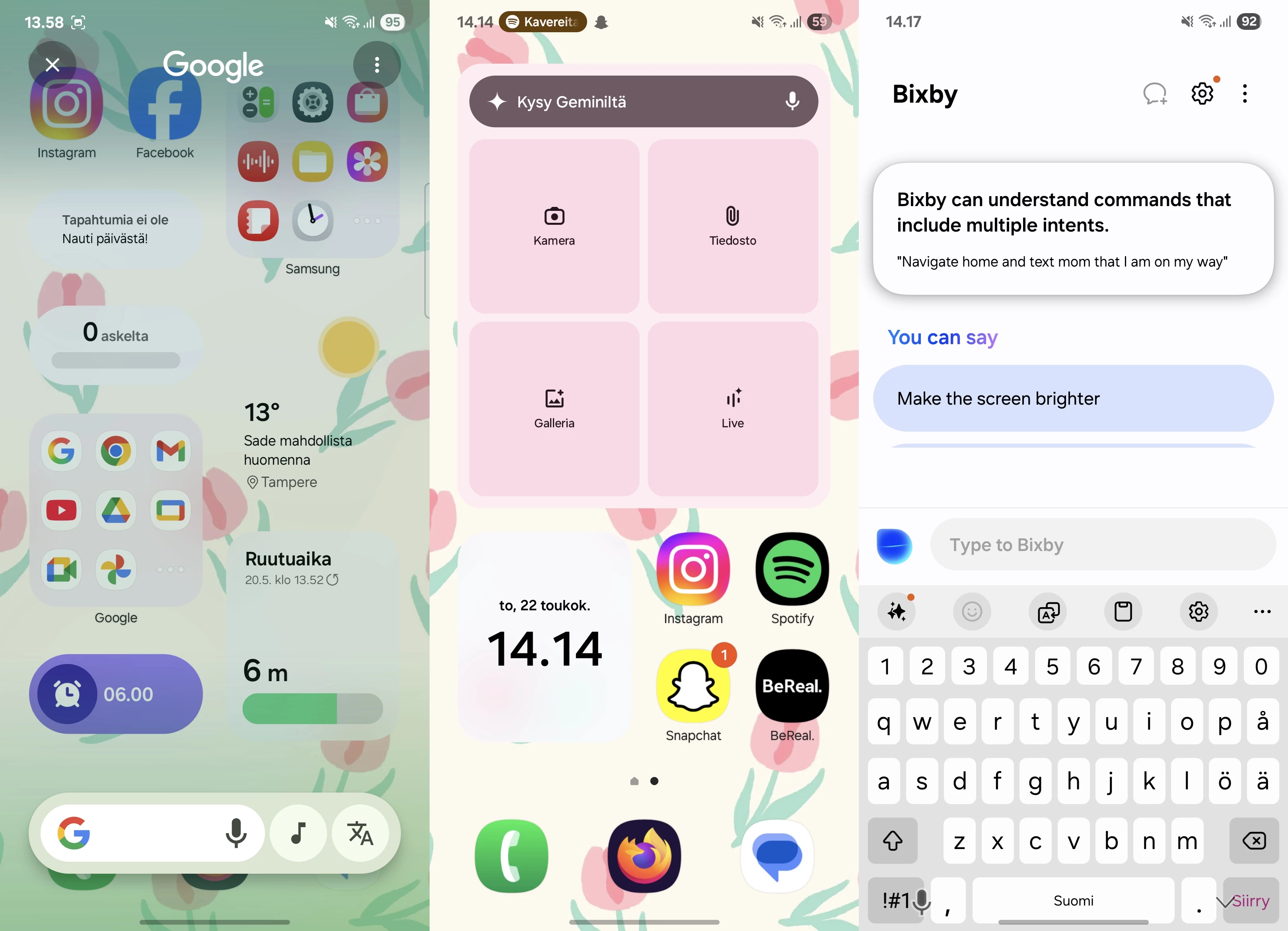 Sinulla on käyttöjärjestelmässä suoraan käytössäsi kaksi tekoälyavustajaa, Googlen oma tekoäly Gemini ja jo aiemmista Samsungin järjestelmäpäivityksistä tuttu Bixby. Jos haluat etsiä näytölläsi näkyviä kuvia tai tekstiä, voit painaa pitkään näyttösi alakulmasta, mikä aktivoi Geminin, jonka avulla voit siirtyä suoraan Google-hakupalveluun tai esimerkiksi Google Translator -käännöspalveluun.