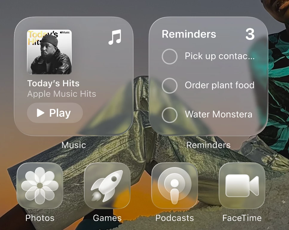 - Käyttöjärjestelmän merkittävin uudistus kohdistuu sen visuaaliseen ilmeeseen. Liquid Glass hyödyntää läpinäkyvyyttä, valon taittumista ja kolmiulotteisuutta. Lisäksi sovelluskuvakkeet ja widgetit reagoivat ympäristön väreihin ja laitteen liikkeeseen.