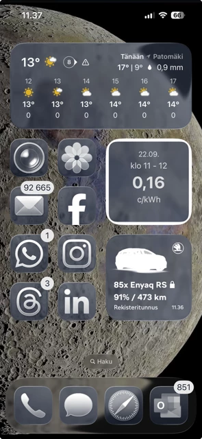 - Toinen visuaalista ilmettä muuttava uudistus kohdistuu sovelluskuvakkesiin ja widgetteihin. Voit sijoittaa widgetit täysin vapaasti tai halutessasi voit muuttaa värimaailmaa kirkkaasta tummaan tai sävytettyyn teemaan.