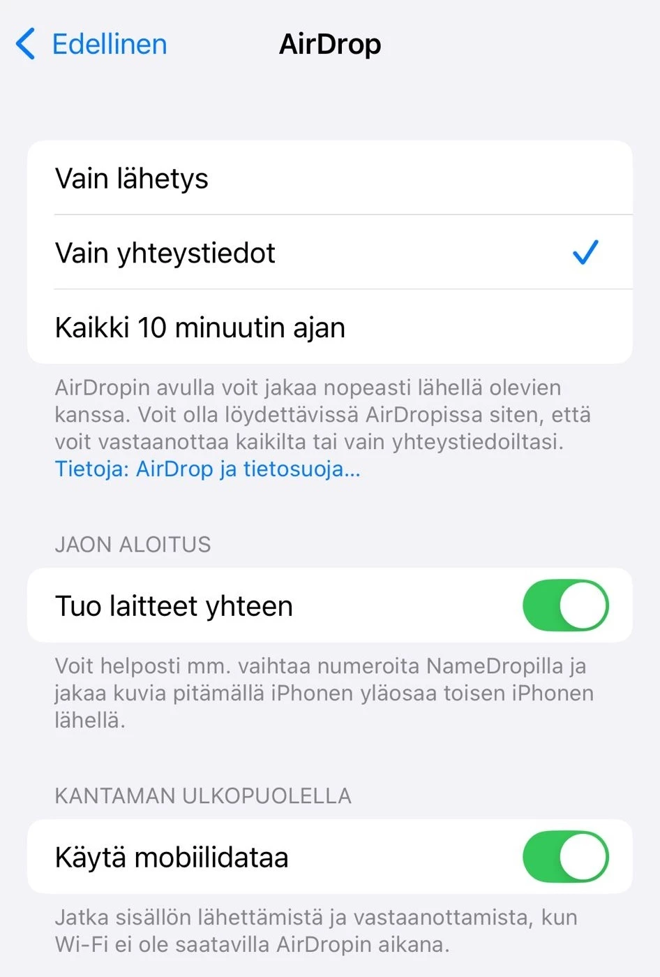 Avaa Asetukset → Yleiset → AirDrop ja valitse joko Vain yhteystiedot tai Kaikki 10 minuutin ajan. Varmista myös, että Bluetooth ja Wi-Fi ovat päällä.