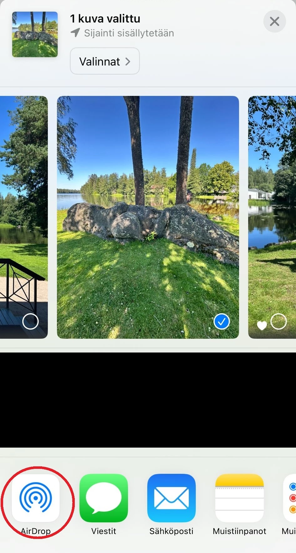 Paina Jaa-painiketta → valitse vastaanottajan tai -ottajien nimi/laite AirDrop-listasta → vastaanottaja hyväksyy siirron.
