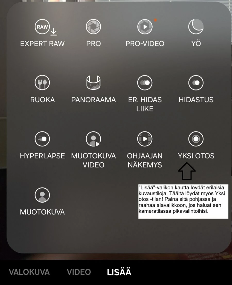 Jos toiminto ei näy suoraan nopeasti valittavissa olevista kuvaustiloista, selaa tiloja vasemmalle, kunnes näet vaihtoehdon Lisää. Valitse sen alta Yksi otos.