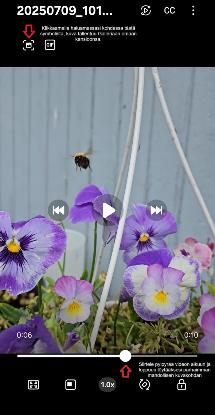 Yksi otos -toiminnolla tallennetusta videosta on mahdollisuus poimia vielä monen monta hienoa tilannekuvaa itse manuaalisesti. Tässä muutama oma esimerkkini kimalaisen lennosta: