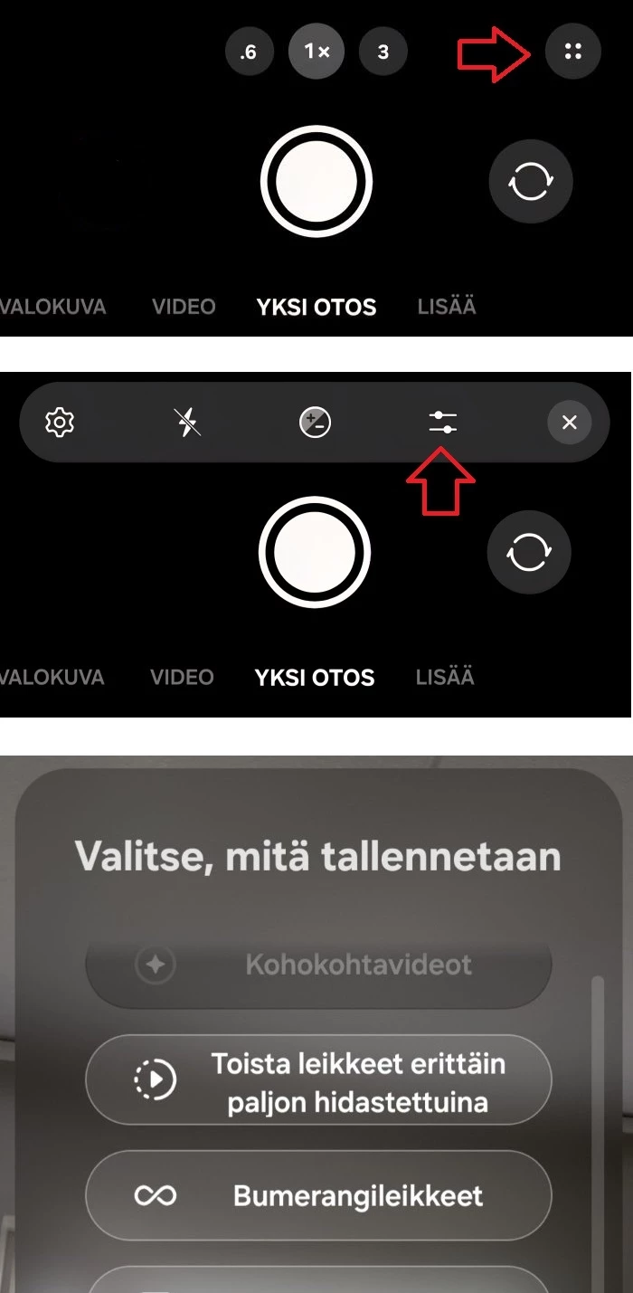 📢 Vinkki: Yksi otos -toiminto tallentaa yhdellä painalluksella useita kuvia ja videoklippejä, joten tallennustilaa kuluu luonnollisesti enemmän kuin tavallisessa kuvaustilassa. Omasta kokemuksestani suosittelen käymään tallentuneet sisällöt läpi mahdollisimman pian – jos ne jäävät myöhemmäksi, perattavaa voi kertyä helposti satoja otoksia, ja läpikäynti voi lopulta viedä useita tunteja.