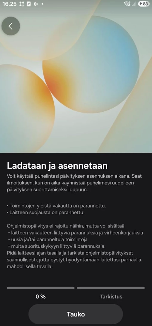 Ilahduttavaa on huomata, että Samsung on ottanut vihdoin käyttöön nopeammat järjestelmäpäivitykset. Samsung on ollut viimeisiä valmistajia, jonka puhelimien ohjelmistopäivitys on vaatinut pitkähkön uudelleenkäynnistyksen. Nyt sitä ei enää tehdä, vaan ohjelmisto rakentuu kahdesta osasta, A ja B-osasta. Vain toinen niistä on kulloinkin se, josta puhelin käynnistetään, joten ohjelmistopäivitys voi päivittää esimerkiksi tuon B:n taustalla ja kokonaisaika, kun puhelinta ei voi käyttää ollenkaan (katsellaan selällään makailevaa Android-ukkelia), on vähentynyt muutamaan hetkeen.