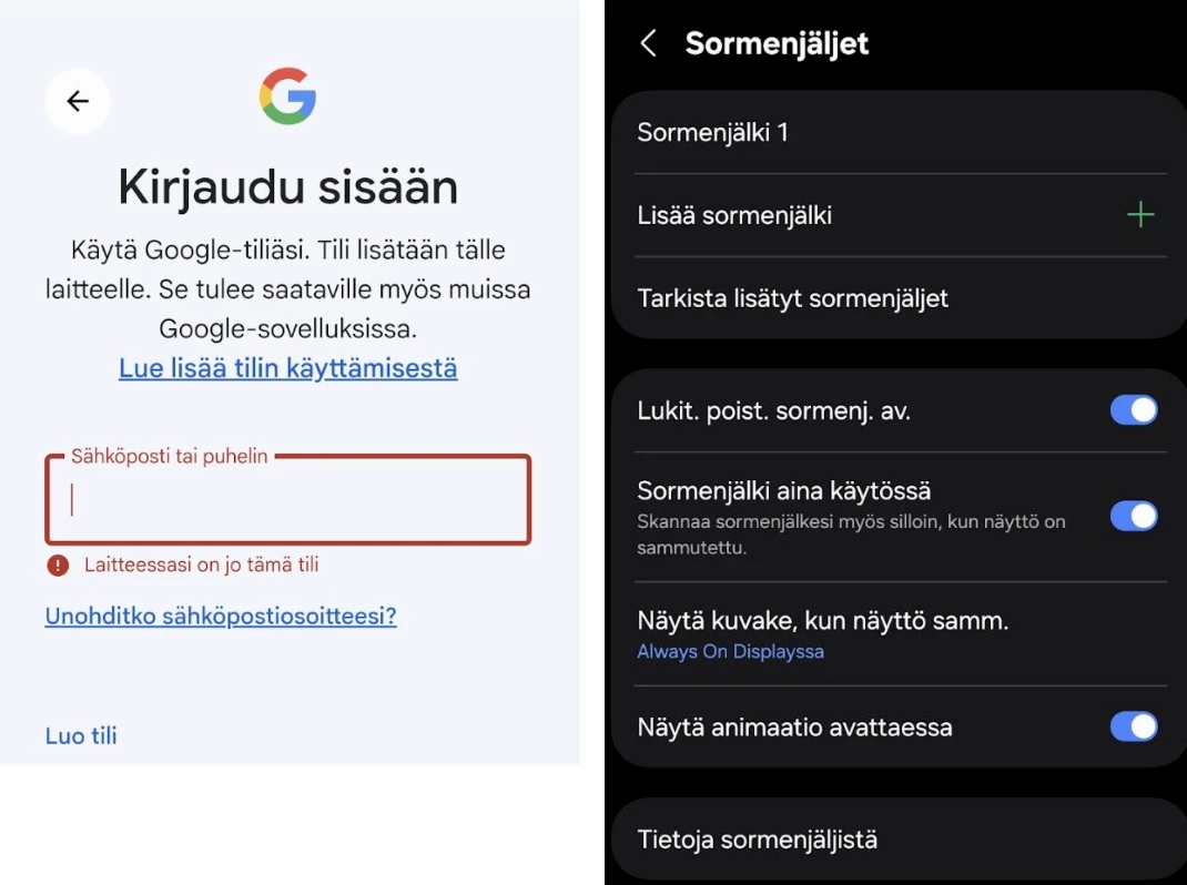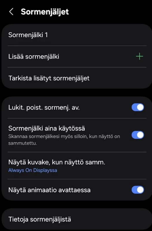 Lisäksi kun sormenjälkeä lisäilin, ei tuo sormenjälki lukitusta suostunut poistamaan, vaan oli jäänyt täppä ”Lukit. poist. sormenj. av.” pois päältä. Kuka on ollut Samsungilla keksimässä tämän lyhennehirviön tai miksi jos lisäät puhelimen käyttöönotossa sormenjäljen, se ei oletuksena mene lukituksen poistotavaksi? Pari kertaa piti kahlata asetusvalikko läpi, jotta tuon älysin. En muista, että olisin ollut S24U puhelimeni kanssa samassa tilanteessa.