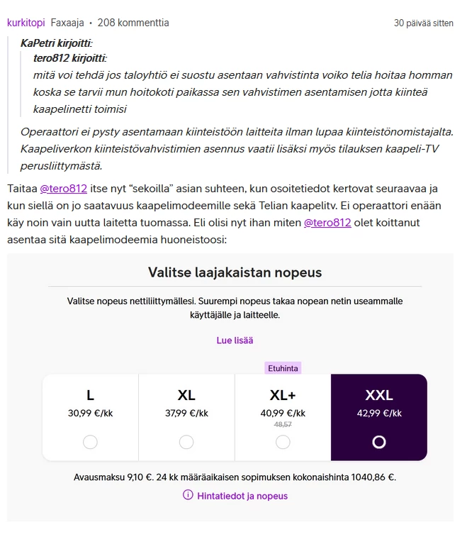 mitä voi tehdä kun hoitokotiin saisi kaapelinetin mutta isännöitsijä tai taloyhtiö ei hoitokotiin aio asentaa tai laittaa sen toimintaan tarvittavaa vahvistinta sanoivat ettei kaikissa taloyhtiön taloissa ole vahvistinta ja ettei kaikkiin taloyhtiön taloihin kaapelilaajakaistaa saa eikä asenneta niin mihin voin valittaa päätöksestä entä jos telialle maksaa hyvin niin voiko telian porukka sen vahvistimen asentaa jotta minullekkin tulisi mahdoillisuus kaapelinetin saantiin nyt on dna 5g 1000m netti jossa käytössä b20 ja n78 taajuutet ja lataus nopeus jotain 350-425 megaa vaihtelee mutta tuota väliä on ja lähetys nopeus 92 ja pingi 19-28 ja lataus latenssi väliltä 50-80 ja lähetys latenssi 255 niin miltä nuo 5g nopeutet kuulostaa että vaikka en nykyiseen hoitokotiin saisi kaapelinettiä niin näyttäisikö mulla kuitenkin olevan aivan riittävän nopea netti somen käyttöön ja netti ostoksiin ja pankkiasioiten hoitoon ja suoratoistoihin ja isojen pelitiedostojen lataamiseen ja jos haluan tehdä valituksen ettei taloyhtiö ja kiinteistö ja isännöitsijä kukaan halua kaapelinetin tarvimaa vahvistinta asentaa niin mitä on tehtävissä eli kertokaa minkälainen mun 5g yhteys teistä on ja mihin se riittää ja mitä on tehdävissä jos haluaa että vahvistin asennetaan jotta saisin kaapelinetin sopimus purettiin juuri sen takia kun kaapelinetti ei tässä talossa vahvistimen puuttumisen takia mulla toimi voisiko relacomin tai telian miehet tulla asentaan vahvistimen vai tarvitaanko tähän kiinteistön ja taloyhtiön lupa