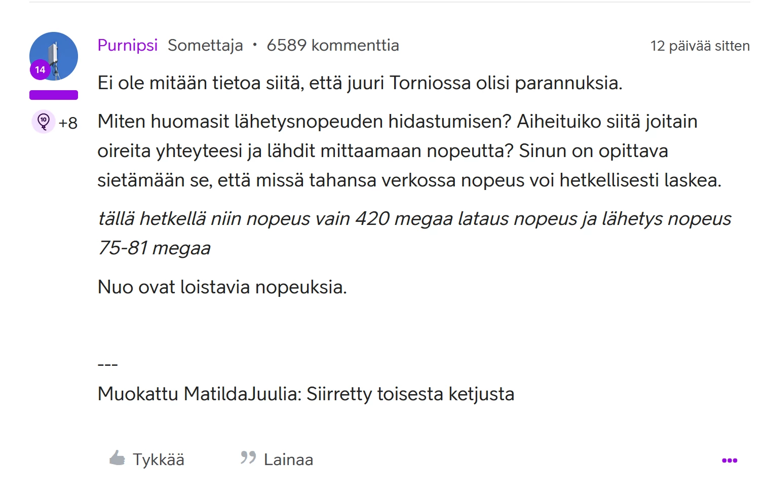 mun ulkoanteeni on korkealla ulkoseinässä ja korkeassa anteeni tangossa kiinni ja suunnattu etelässä olevaan tukiasemaan ja kaupunki torniossa ja kun oli hetken häiriöitä kun verkkoa parannetaan niin nopeus kävi noin 750 megassa ja nyt kun verkkoa ei vissiin korjata tällä hetkellä niin nopeus vain 420 megaa lataus nopeus ja lähetys nopeus 75-81 megaa niin mitä voi ottaa kun parannuksia tehdään nouseeko lataus ja lähetys nopeus ja laskeeko pingit ja lataus latenssi ja lähetys latenssi jos täällä joku on työntekijä niin voitteko sanoa että torniossa etelän suunnassa olevaa tukiasemaa täytyy optimoita eli kapasiteettia lisätä ja verkon tekniikkaa uusia mutta tuskin täällä telia yhteisössä on yhteisverkon rakentajiin yhteyksiä vai onko koska olin alussa hoitokotissa ryhmä huoneessa niin nopeus oli erissä tukiasemassa 740 megaa ilman anteenia ja kun huone vaihtui ja kun anteeni asennettiin ja suunnattiin etelän suunassa olevaan tukiasemaan niin nopeus on nyt ollut vain 480 megaa lataus nopeus eli laski huoneen vaihdon takia eikä edes anteeni täysin poistanut onkelmaa vain yhteys laski 740 megasta 480 megaan sitten kun verkkoa torniossa parannetaan niin olisi kiva jos anteenilla saisi 1000 megaa lataus nopeuteksi