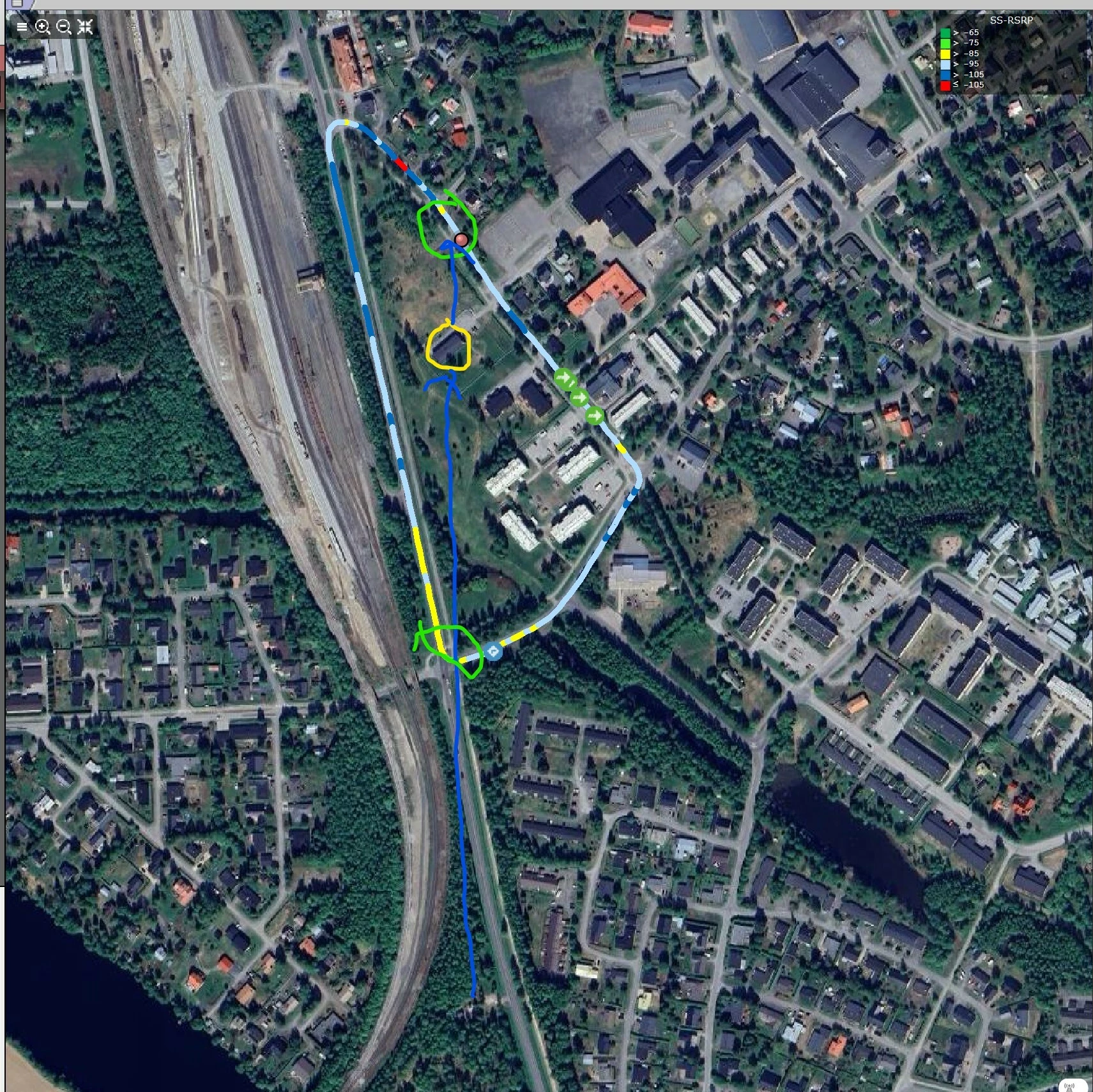 Vertailuna katsottu Tero812 tilannetta Elisan sim-kortilla ja nyt tilanne näyttää huomattavasti paremmalta, kum yhteys tulee tuolta etelänpuolelta. Tuossa saitissa Elisan antennit ylempänä, joka auttaa asiaa. Vihreällä merkatuissa mittapisteissä, jotka samalla linjalla Teron paikan kanssa downlink siinä 800 Mbps tasoa puhelimella ja enemmän vahvistavalla 5G reitittimellä on lupa odottaa vieläkin parempaa sitten. Nällä aineksilla sitten ratkaisua rakentamaan. Etäisyyden puolesta pöytämallin 5G reititin on riittävä, se pitäisi vaan laittaa ikkunan lähelle tuohon tukiaseman suuntaan.