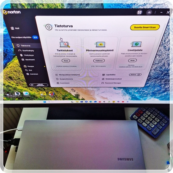 Viiden laitteen F-Secure paketti tuli täyteen Apple laitteista. Samsung kannettava jäi ilman suojaa, joten hankin siihen Norton 360 Deluxe paketin. 5 laitetta vuodeksi 17,57€.