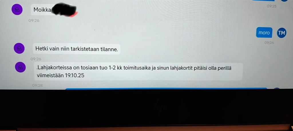 On se vaikeaa vastata kun kysyy miksi lahjakortti on myöhässä . Onko tämä firman tapa vai mistä on kyse. Epäluotettavuus oikeen ajaa kilpailijalle . Juhannukseksi luvattiin . Kuinka monella sama tilanne . Luodaanko oma Facebook ryhmä jollei asiat tule kuntoon ?