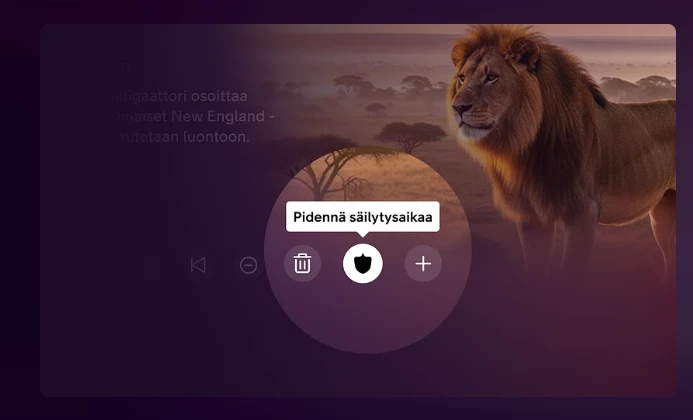 Monet käyttäjistä haluavat rakentaa omia ohjelmakirjastoja ja palata suosikkisisältöihin myöhemmin. Nyt tämäkin onnistuu ilman kiireen tunnetta. Huomioithan, että jokaisen ohjelman, sarjan ja erillisen jakson kohdalla ohjelmasivulta valinnasta “Pidennä säilytysaikaa” -kuvakkeesta voit valita pidennetyn ajanjakson. Olemassa oleville tallenteille tämä on myös nyt mahdollista. Kun 500 tunnin raja täyttyy, uusia pidennyksiä voit tehdä taas tilan vapauttamisen jälkeen.