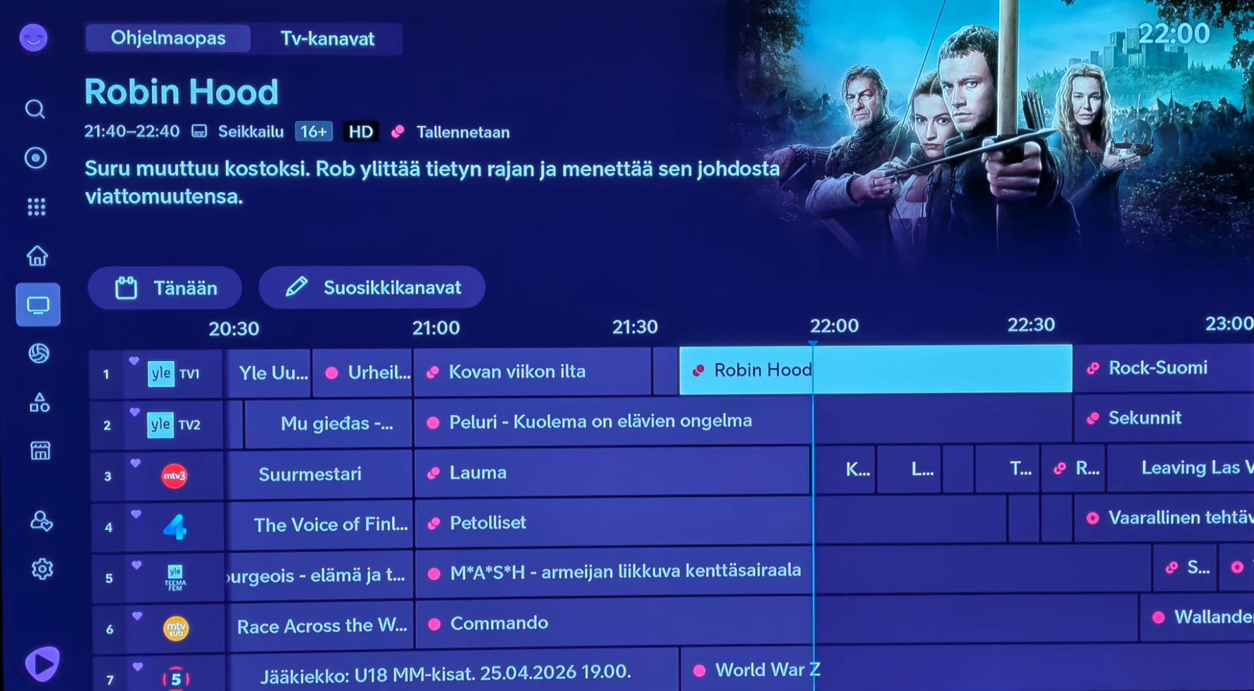 Kanavalta Yle TV1 aloin seurata ohjelmaa “Robin Hood” suorana. Kokeilin [Kanavat]-toimintoa (nuoli alas) ja kas kummaa, ohjelmatietoja ei ole: