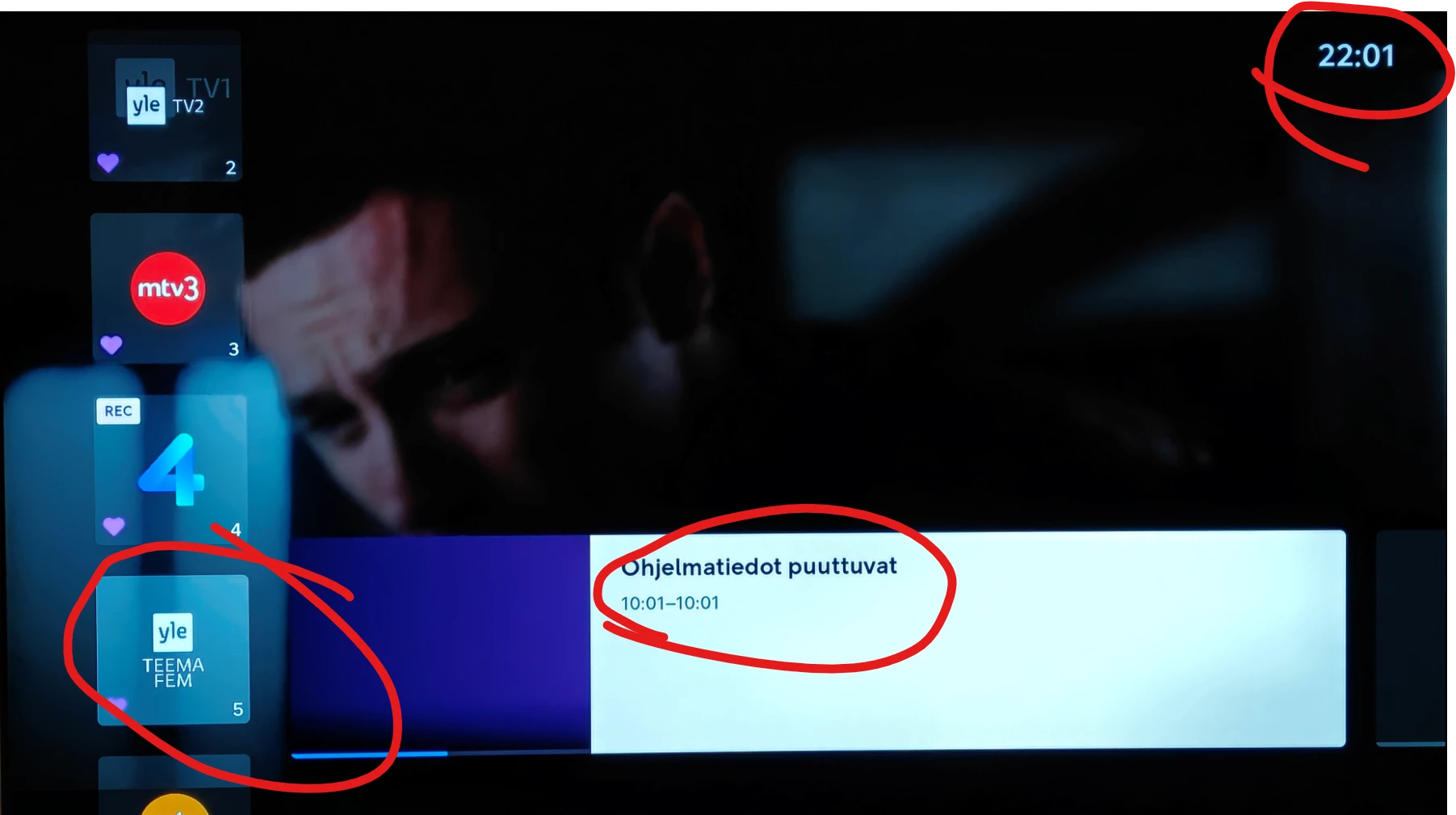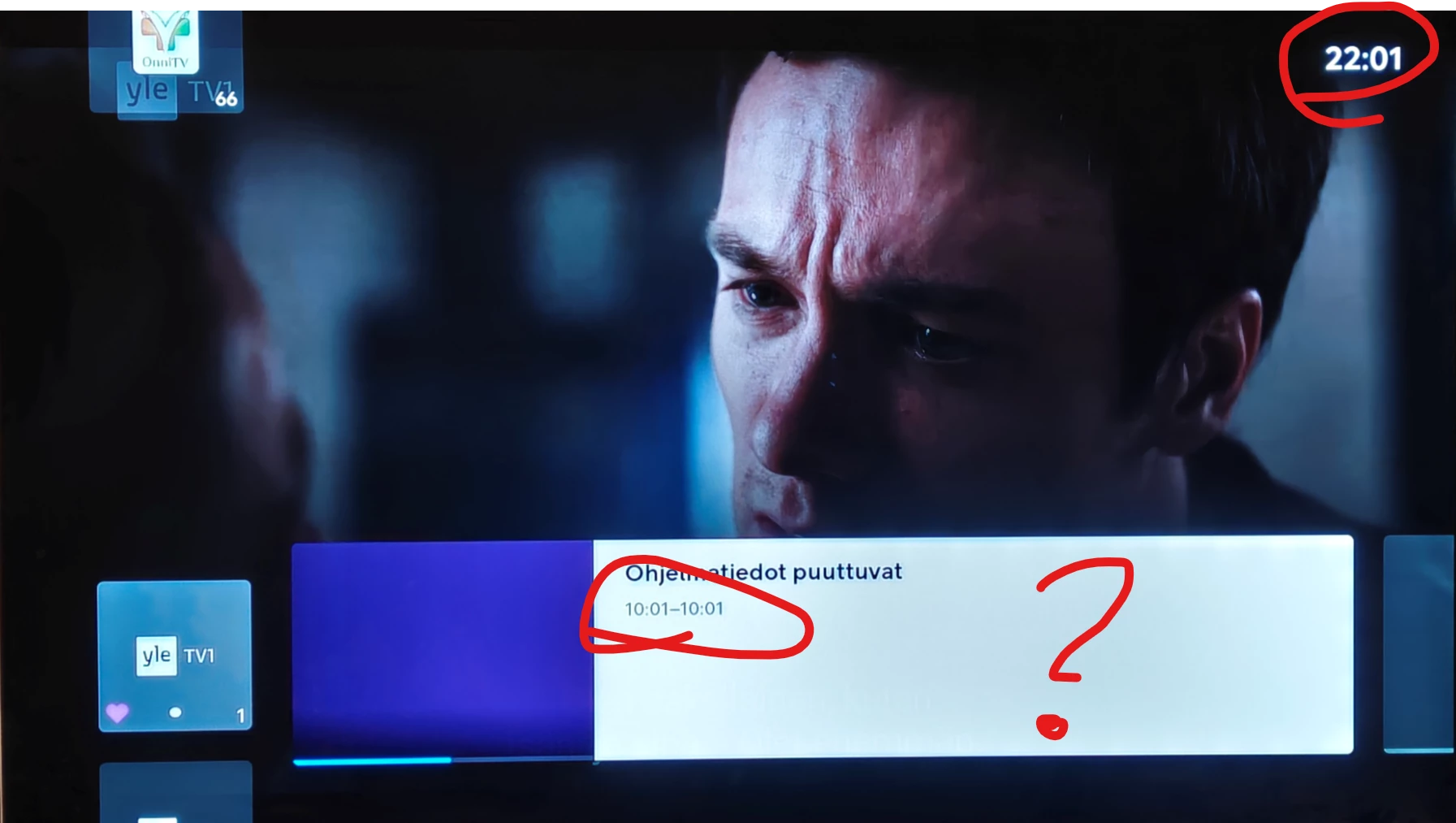 Kiinnittää huomio erityisesti kellonaikaan - oikeassa yläkulmassa 22:01 ja kanavan ruudussa 10:01-10:01. Ongelma taitaa liittyä juurikin kelloon? Miten voi olla että klo 22:01 muuttuu klo 10:01???? Mitään ohjelmaa ei voi olla vissiin menossa juurikin tuossa Telia playn keksimässä aikaikkunassa.