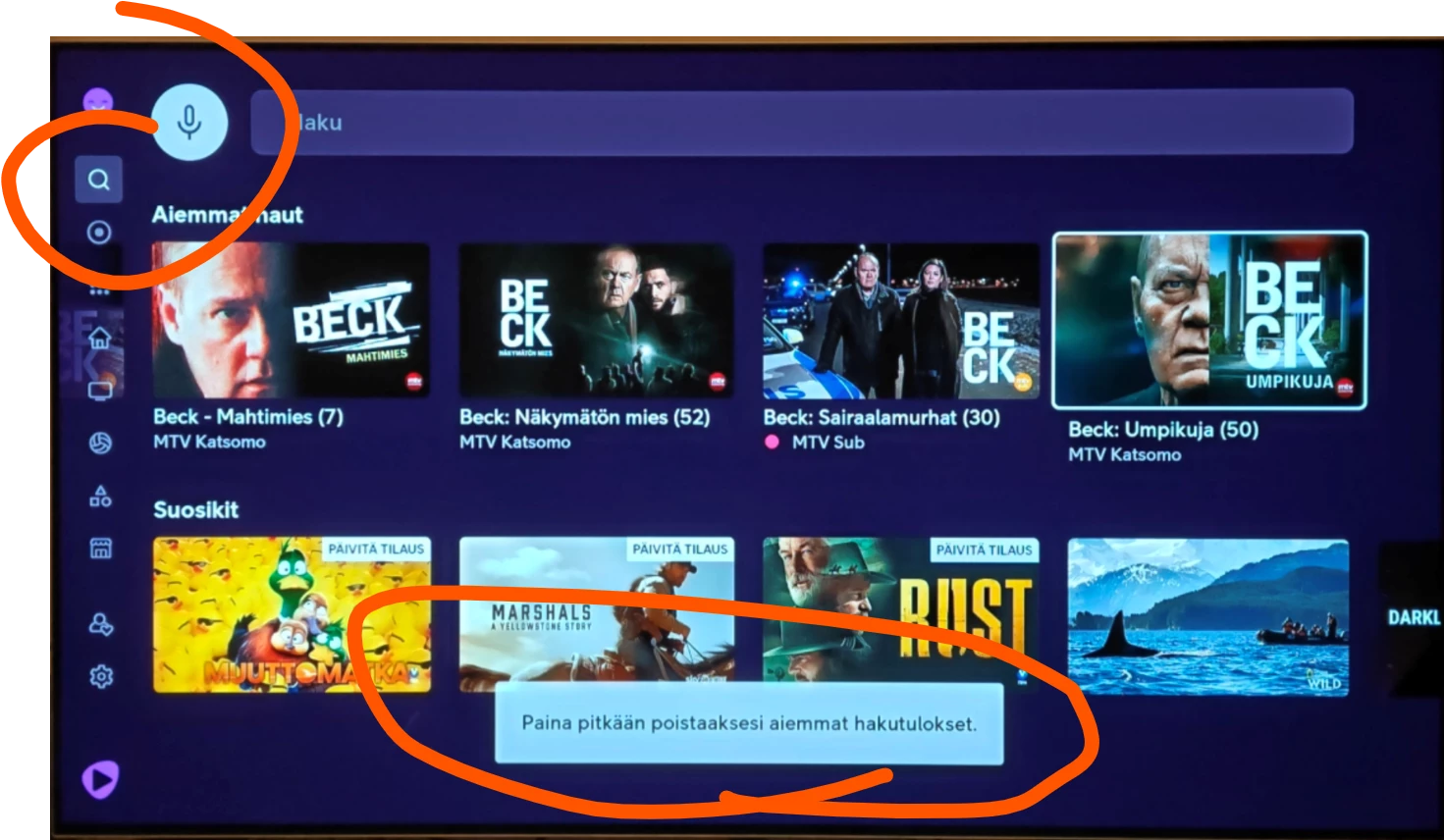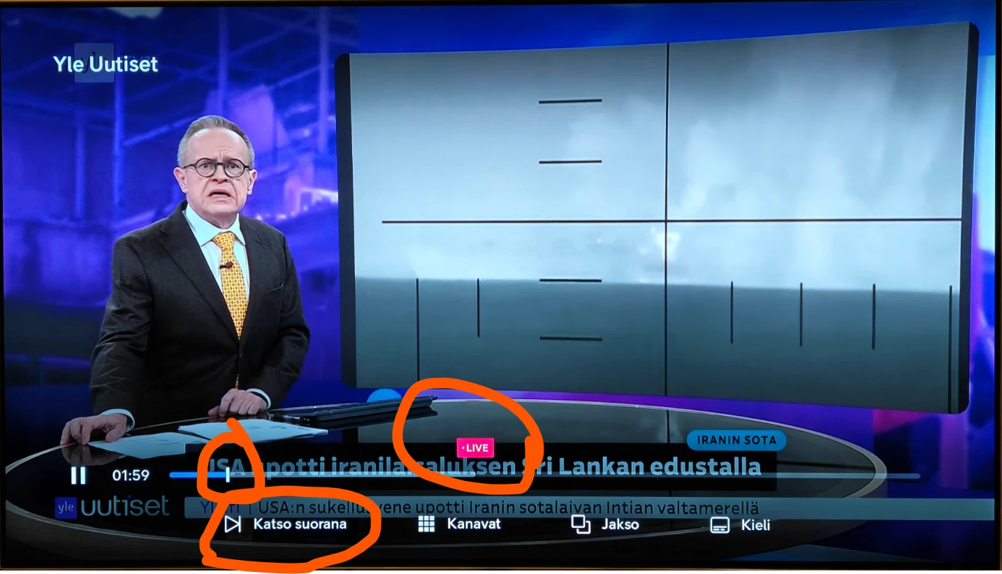 YLE TV1:llä menossa “Sarjakusettaja” ja kiinnostaisi se katsoa alusta. Valinta [OK] ei vie kanavalle, tulee valikko: