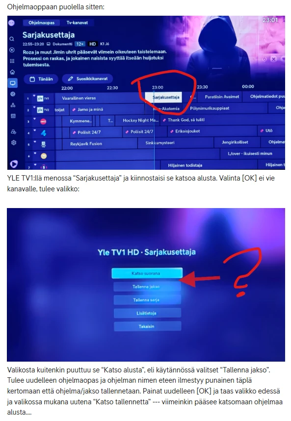 Valikosta kuitenkin puuttuu se “Katso alusta”, eli käytännössä valitset “Tallenna jakso”. Tulee uudelleen ohjelmaopas ja ohjelman nimen eteen ilmestyy punainen täplä kertomaan että ohjelma/jakso tallennetaan. Painat uudelleen [OK] ja taas valikko edessä ja valikossa mukana uutena “Katso tallennetta” --- viimeinkin pääsee katsomaan ohjelmaa alusta….