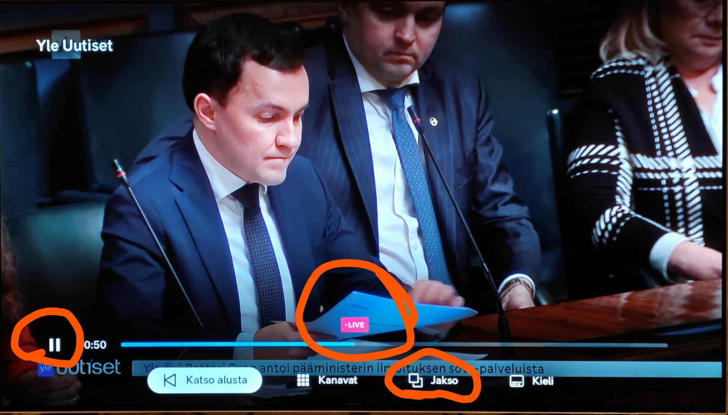 Tämä tekisi mahdolliseksi aina helposti laittaa esim. menossa ohjelma tauolle [play/stop] näppäimellä kun ovikello soi, tarvitsematta kikkailla valikoissa. Ja jatkaa vain katsomista kun on palannut sohvalla tarvitsematta kelailla eestaas niinkuin nyt. Monestikin harmitus siitä että kun ei hokannut ja jäi katsomatta tai tallentamatta joku tärkeä ohjelma - tämä olisi oivallinen juttu niihin. Vähentäisi myös muutoinkin tallennusten tarvetta palvelussa ja väitän että asiakkaat tästä pitäisivät kovasti - tallennuspalvelun myynti kasvaisi jnejne