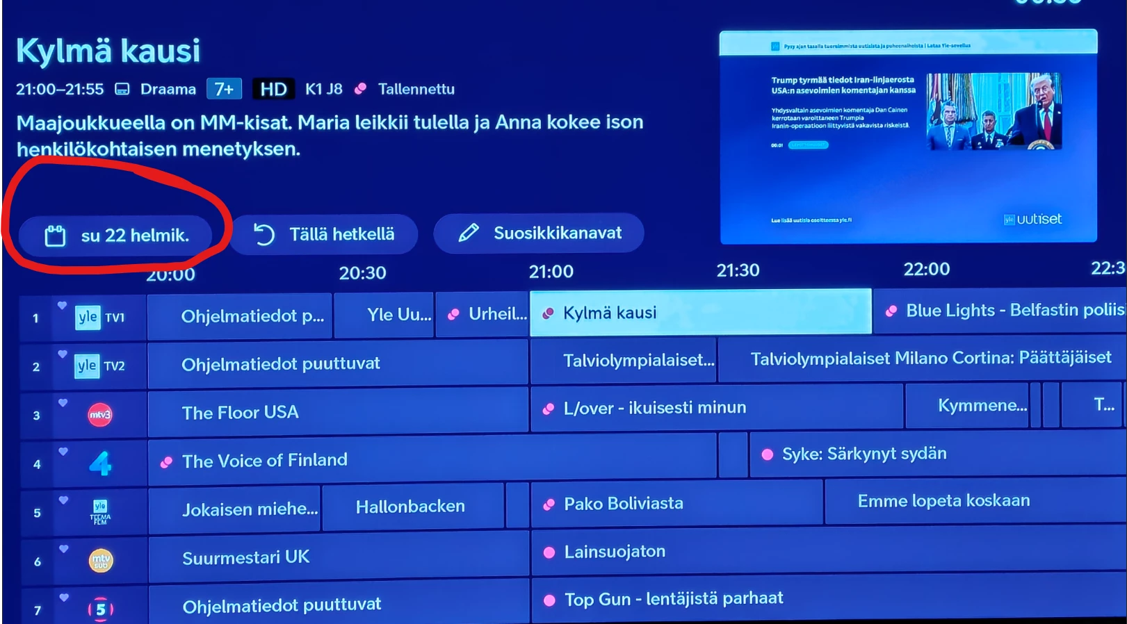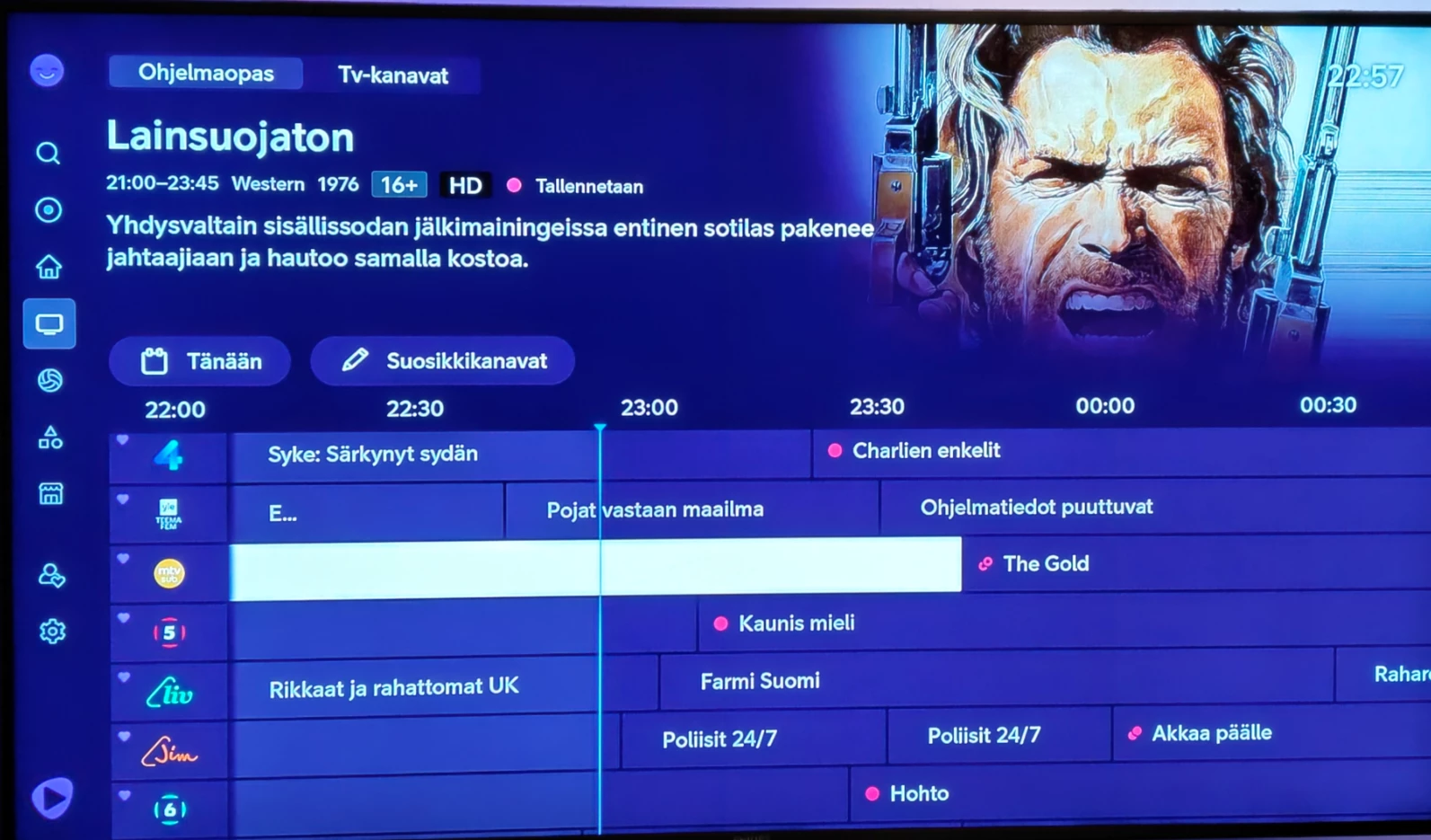 YLE Teema/Fem-kanavalla on ohjelman nimen paikalla “E…” se tarkoittaa että ohjelma alkanut vain hieman ennen kello 22:00. Kun ohjelman nimi puuttuu kokonaan, ohjelma yleensä alkanut sitten jo vähintään 15 minuuttia aiemmin. Kuva otettu sunnuntaina 22.02.2026 klo 22:57. Aika karua - 7 kanavaa näkyvillä listassa ja vain kahden kanavan menossa olevat ohjelmat näkyvät ohjelmaoppaassa
