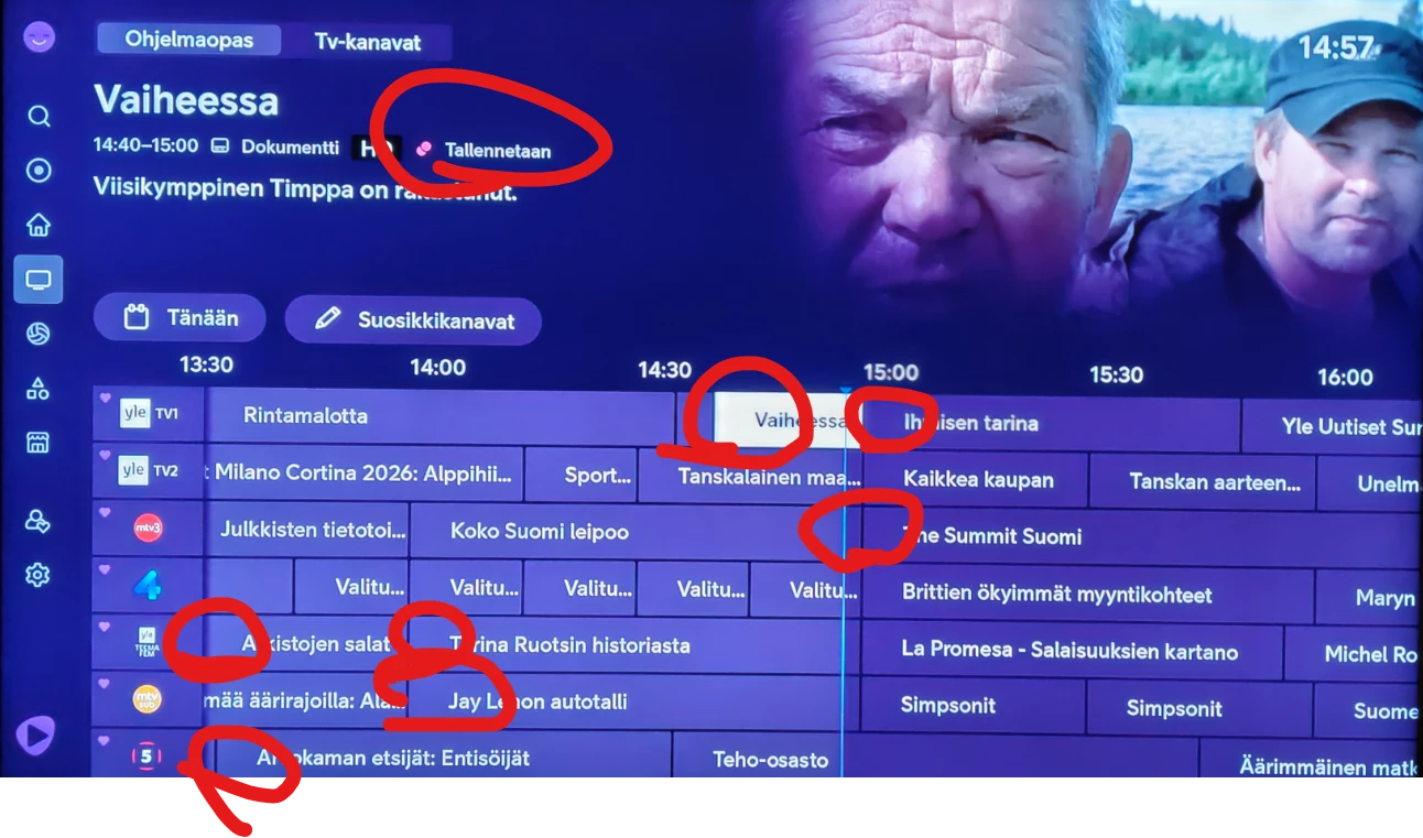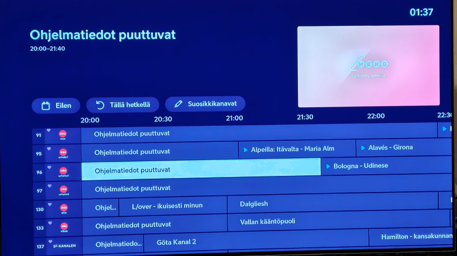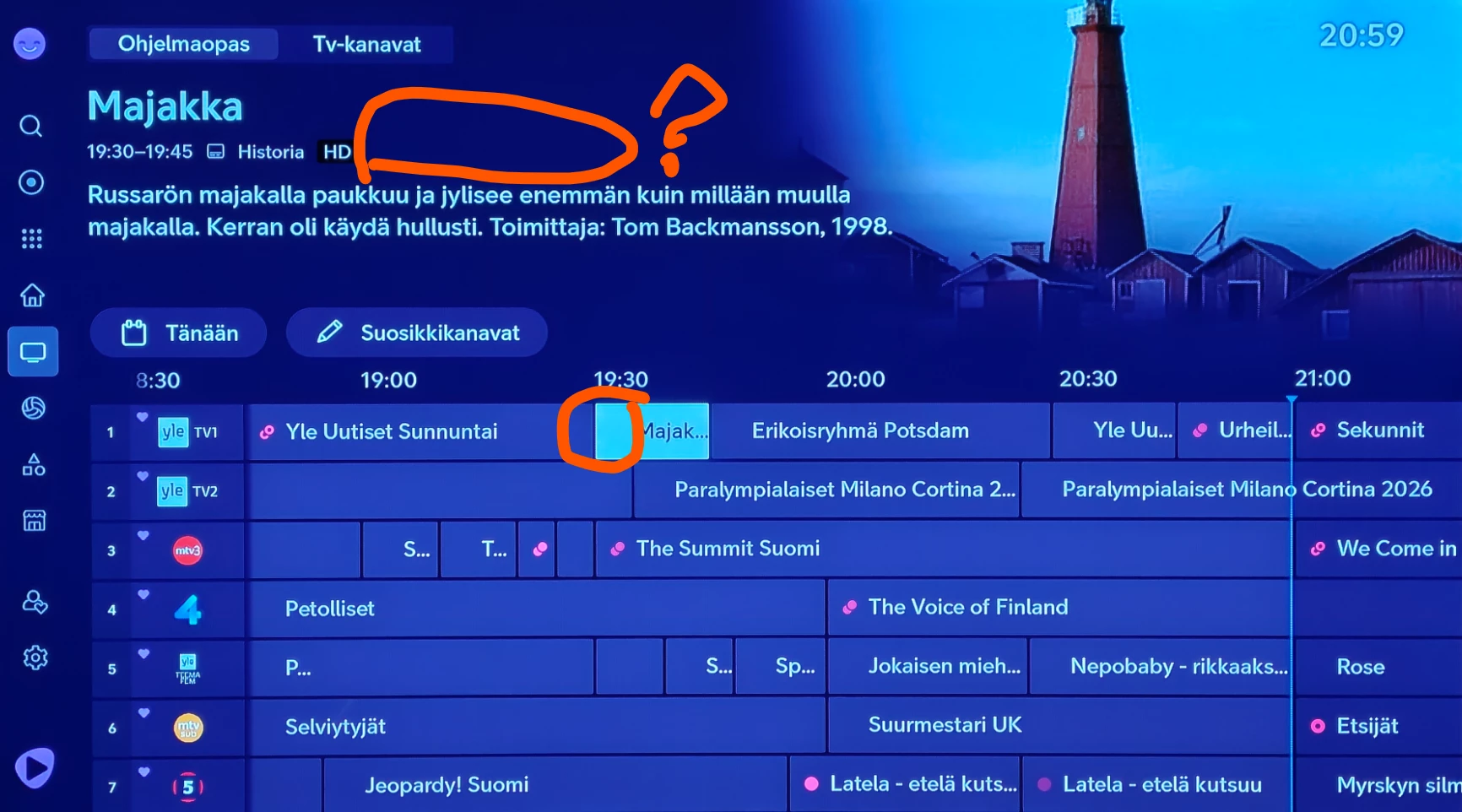 “Uuden” boksin ohjelmaopas ei oikein palvele. Ohjelmaoppaassa on kuvan mukaisesti runsaasti aukkoja. Ohjelman nimi ei näy kokonaisuudessaan muutoin kuin silloin kun ohjelman alkuaika mahtuu mukaan.