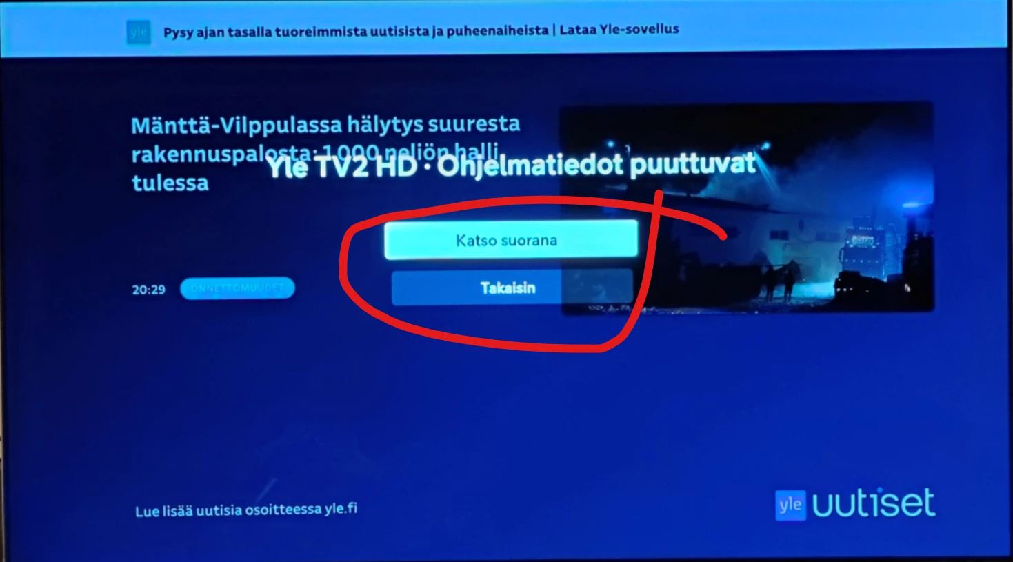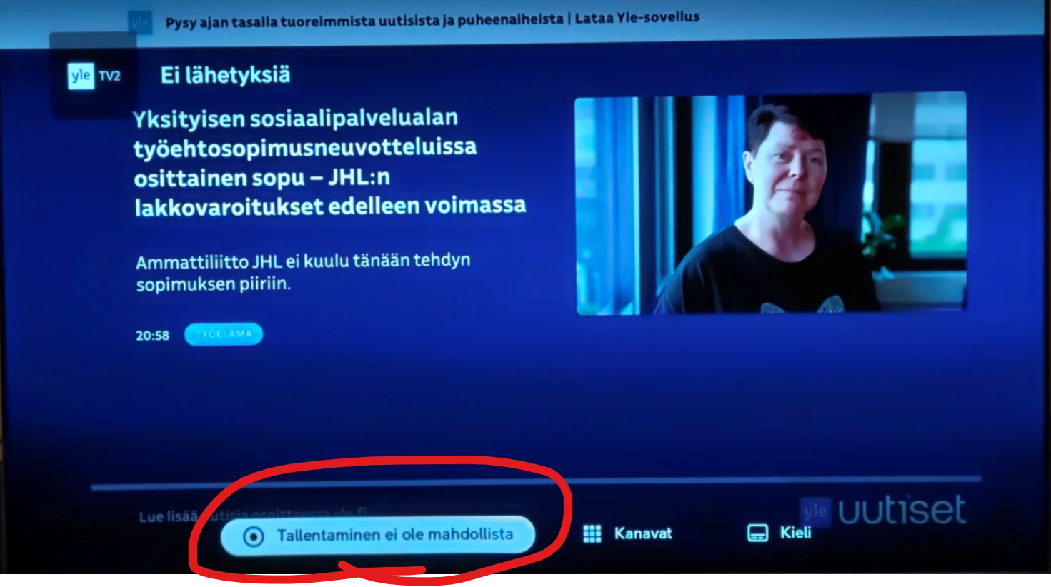 Menee melkoinen tovi viimeisen ohjelman päättymisen jälkeen kun tilanne päivittyy, edelleen samalla kanavalla YLE TV2. Varmaan puolisen tuntia myöhemmin testissä näkyy ohjelmaa katsoessa ja painamalla [OK] ei enää ole mahdollista valita “Katso alusta tai “Tallenna”