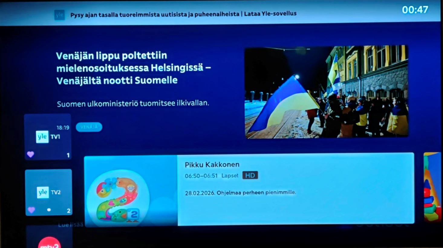 Satuinpa Ylen TV2:lle vajaa 10 minuuttia sen jälkeen kun kanavan viimeinen ohjelma perjantaina päättyi, oltiin toki jo lauantain puolella.