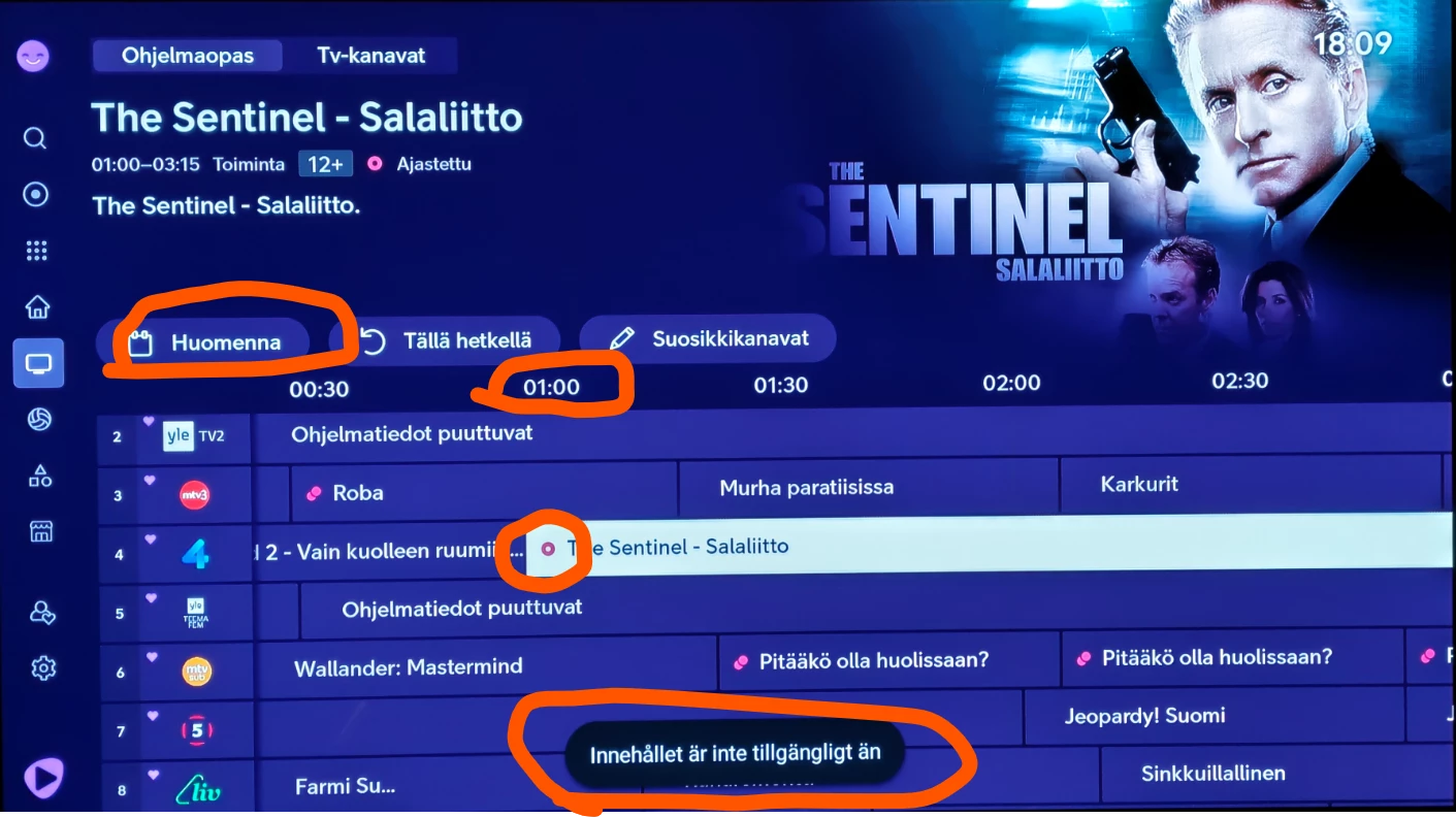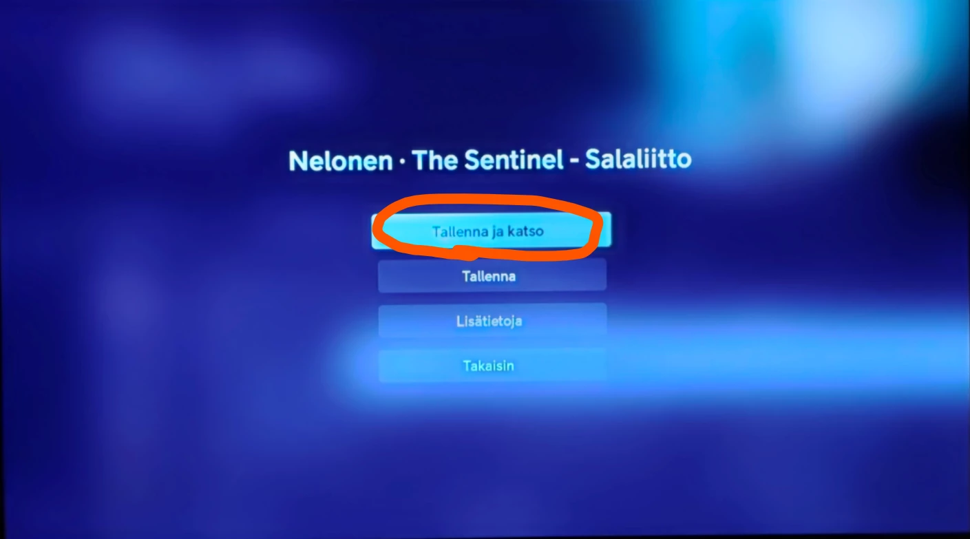 Eikös tämä “Tallenna ja katso” pitäisi kokonaan puuttua siinä tilanteessa kun ohjelma on jossain tulevaisuudessa ja on Nelonen Median kanava. Muiden kanavien kohdallahan lukee “Katso kanavaa”. Tämä ongelma varmaankin vain niillä jotka ovat ns. vierasverkossa käyttämässä Telia play -palvelua..