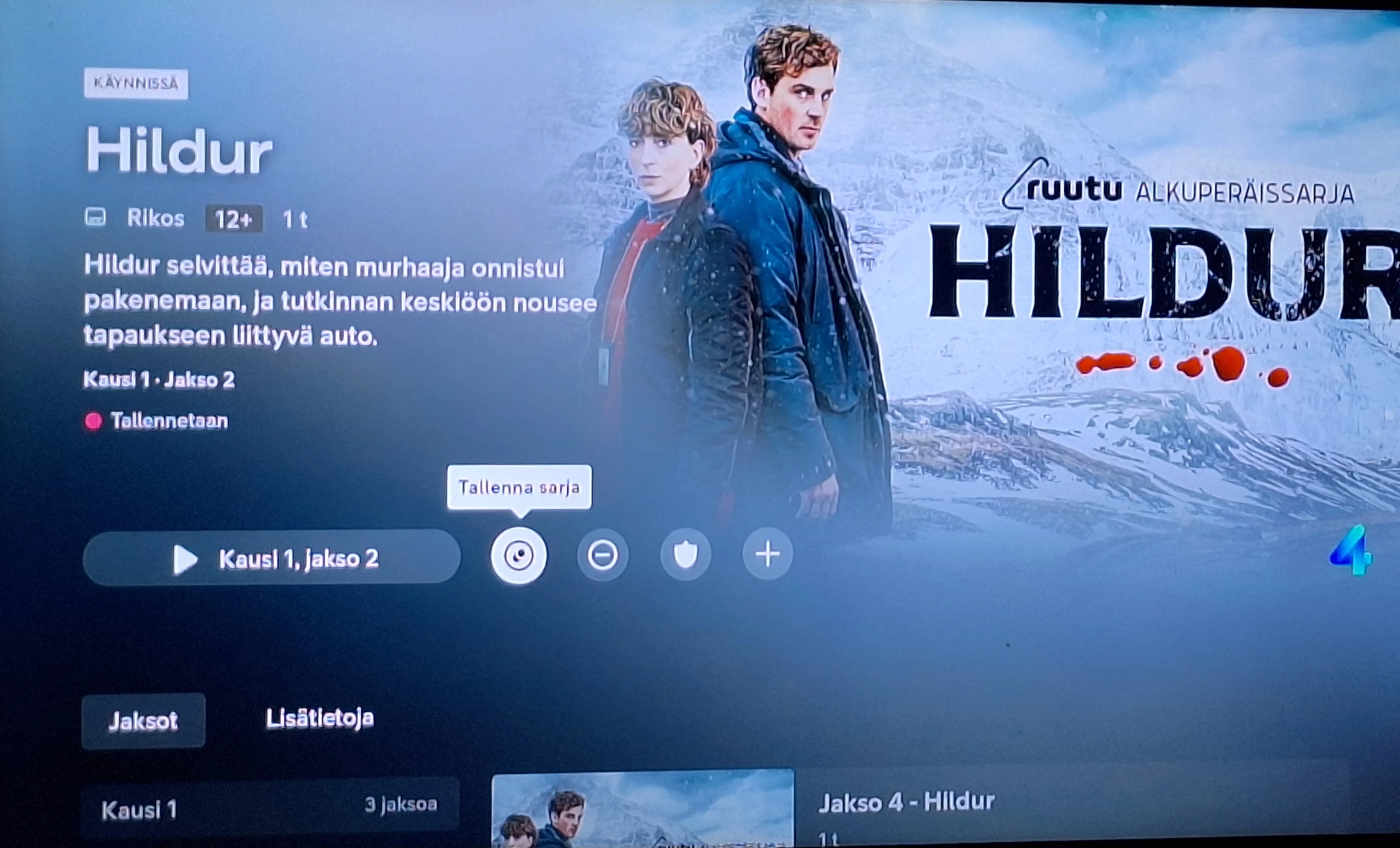 Kun olin tallentanut Hildurista yhden jakson, poistin sarjatallennuksen siitä. Mutta se ei mene ihan putkeen. Tästä kuvasta näkyy, että sarja ei ole tallennoksessa.