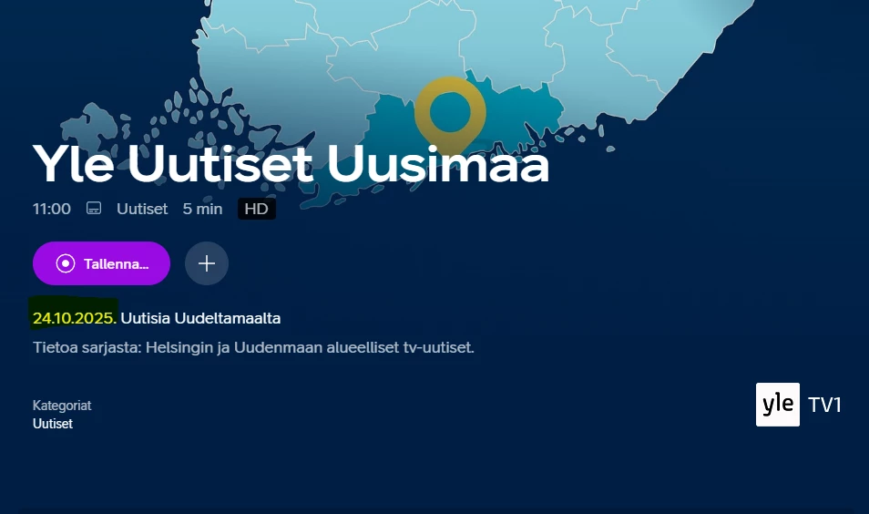 Näyttökopio yllä on eilisen päivän (24.10.2025) ohelmatiedoista. Lähetys kuitenkin on uusinta edellisenä päivänä (23.10.2025) lähetetystä. Tämähän johtaa selvästi katsojaa harhaan